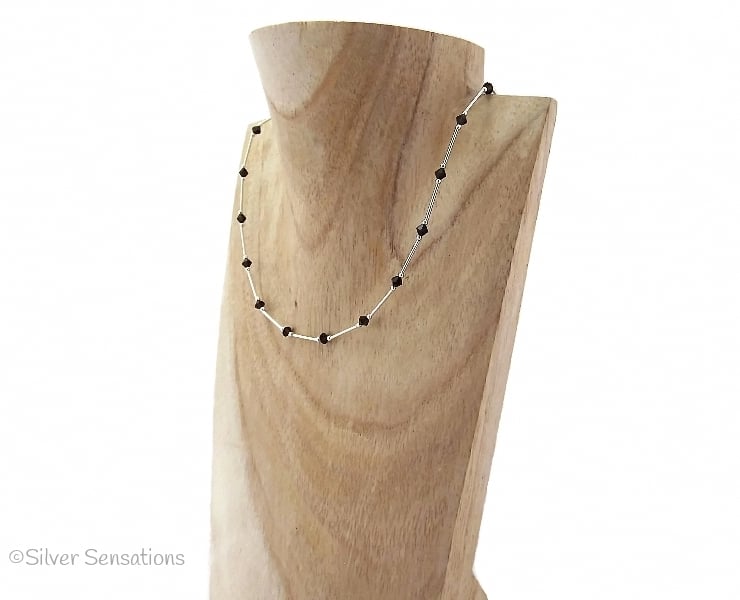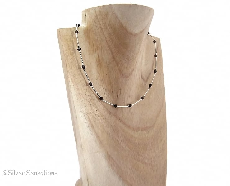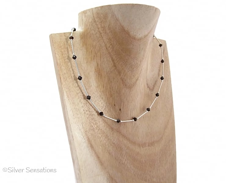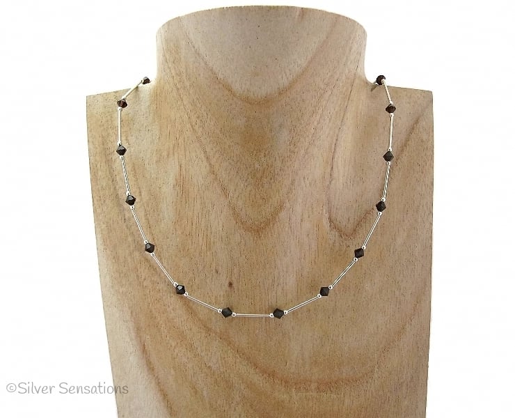 This pretty necklace has been hand crafted using dark brown Swarovski Crystals. In between each Crystal is a Sterling Silver straight tube and seamless beads.