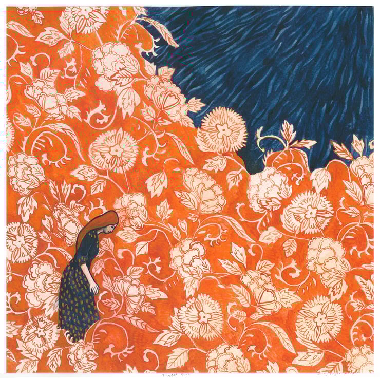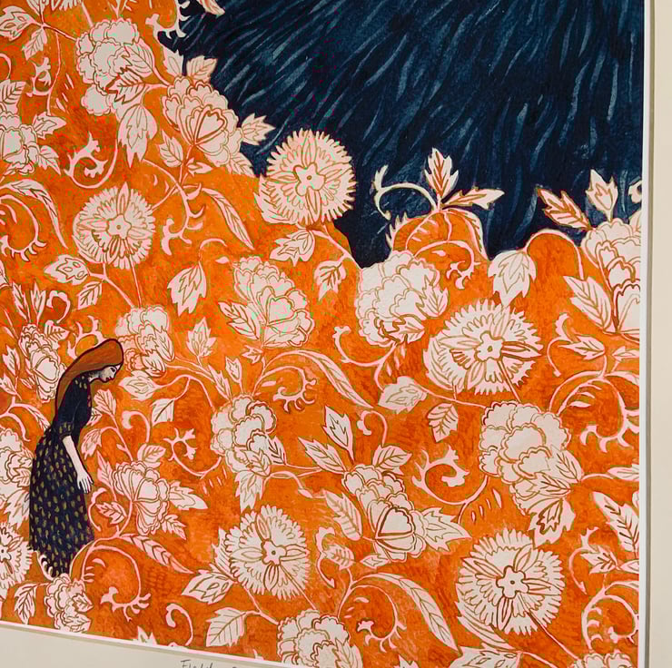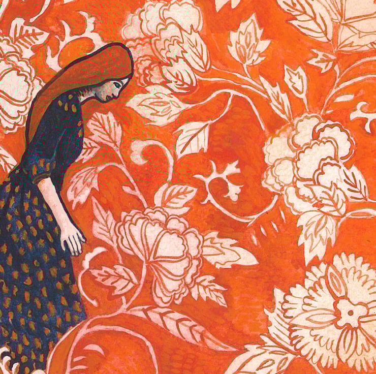 I had two quite different inspirations for this painting, one is German woodcuts, I love the bold lines and graphic quality, the other is hand-painted Indian fabric- just amazing colours and patterns! I tried (and hopefully succeeded!) to merge the two inspirations into an intricate, decorative and timeless image.