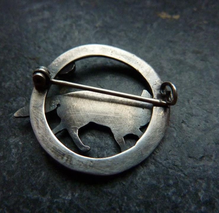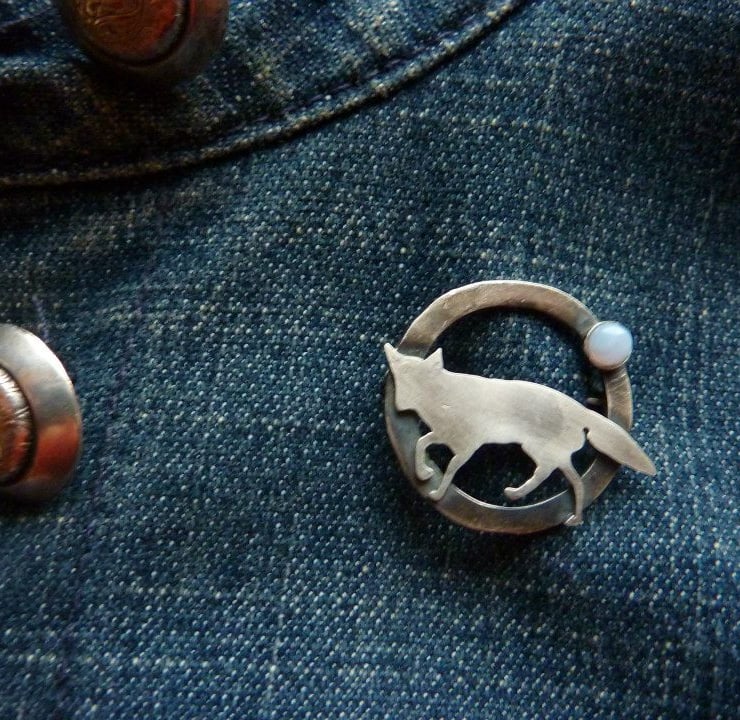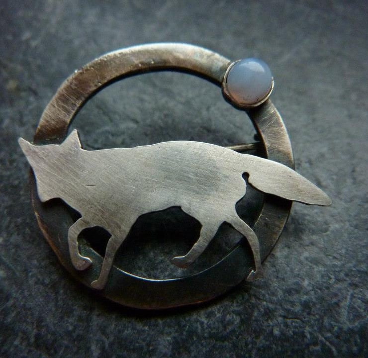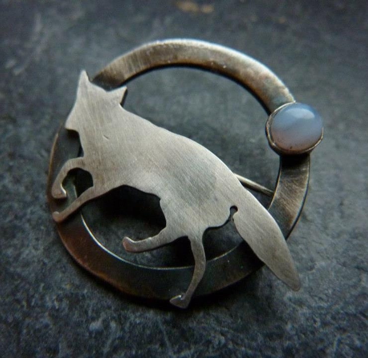 Adorable silver fox prowling the night on a silver circle which has been oxidised for a rugged effect. The brooch is set with a beautiful blue lace agate gemstone (4mm wide) to mimic the moon.