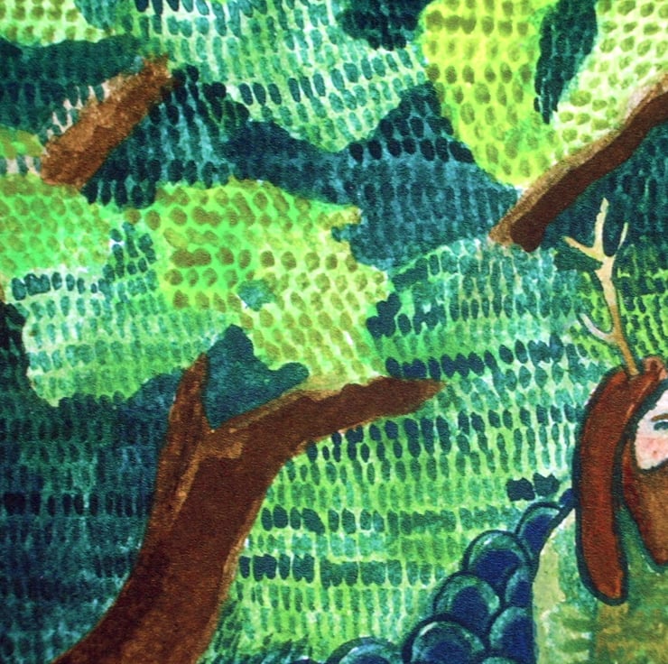I wanted the painting to look like a tapestry so looked at and sketched lots of lovely medieval tapestries in the V&A in London.
