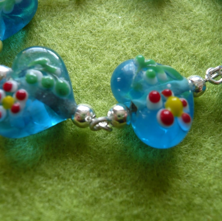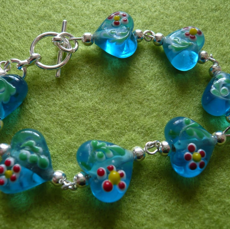 Made from seven 15 mm blue glass heart beads this bracelet measures approx 20 cm. Silver plated toggle clasp fastening. Each heart has a small red and white flower and a green leaf detail.