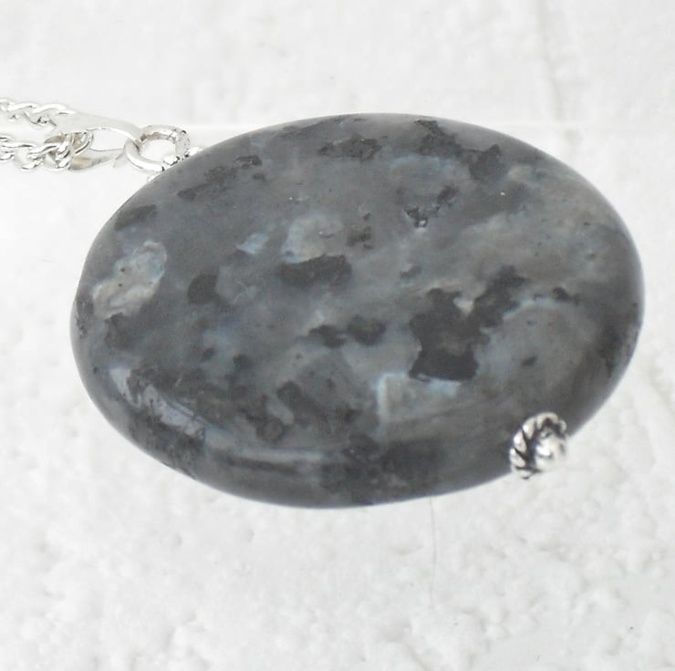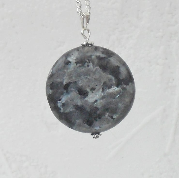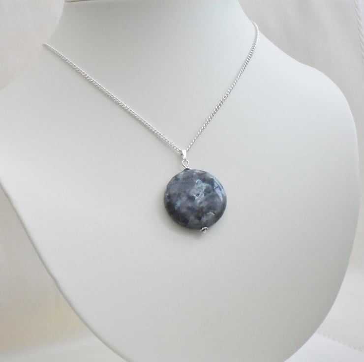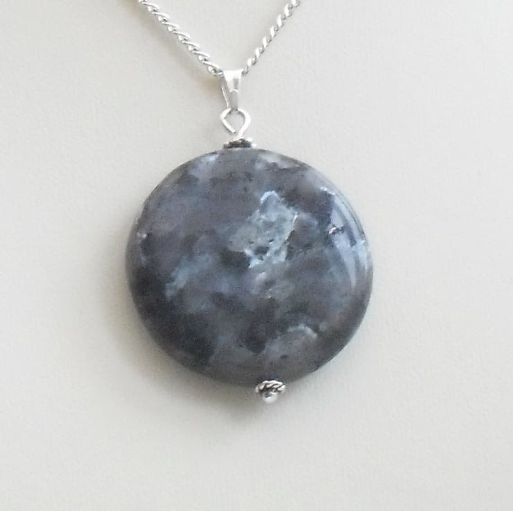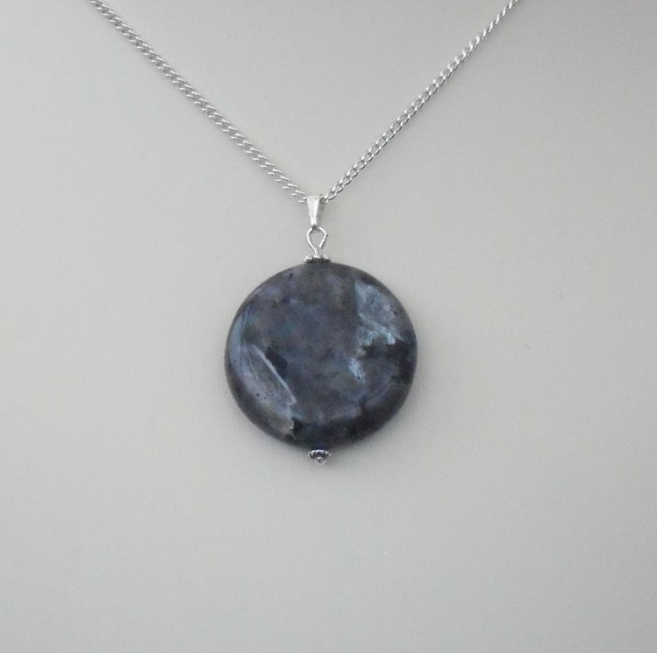 I have hung this coin-shaped labradorite gemstone with silver plated findings on a silver plated chain.