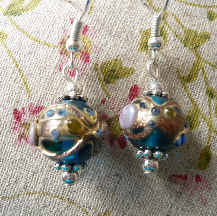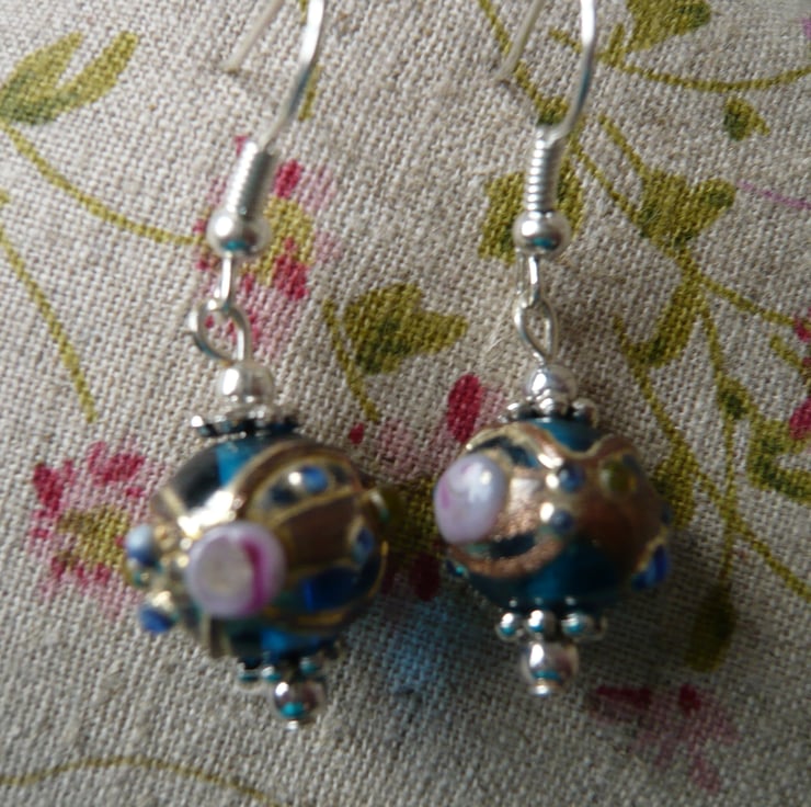 Approx 12mm beads with tibetan flower style spacer beads. Silver plated Ear wire.
