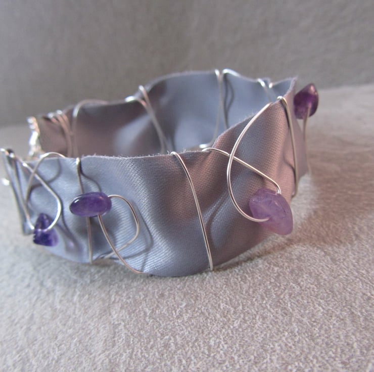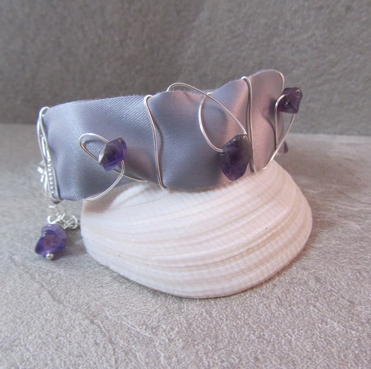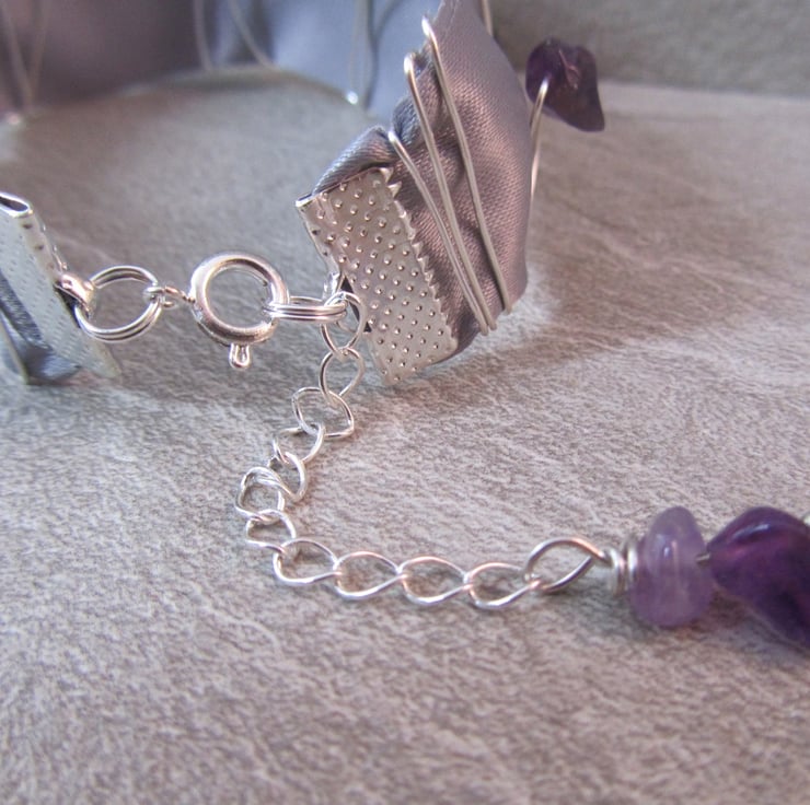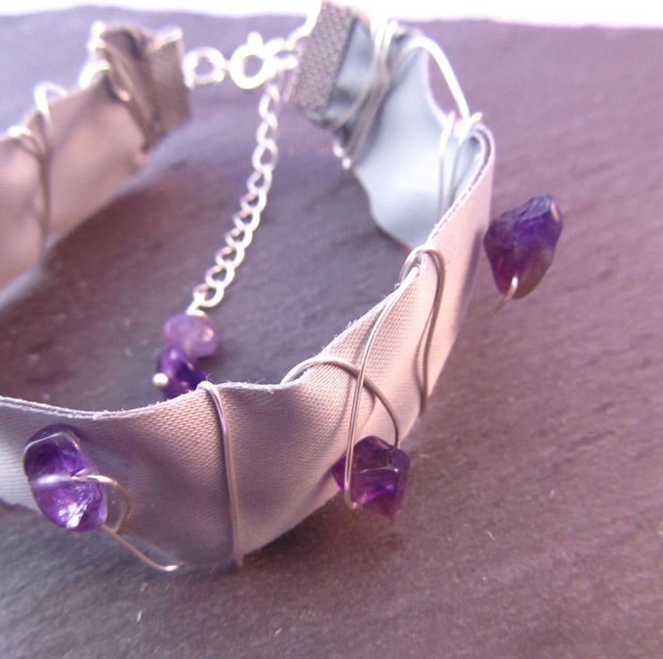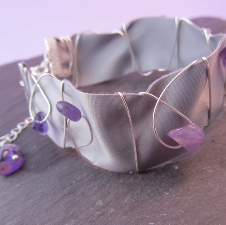 This is a gorgeous amethyst grey ribbon cuff bracelet. It is created with real amethyst gemstone nuggets, grey ribbon, and silver plated copper. Perfect for those who like their jewellery to be a bit different.