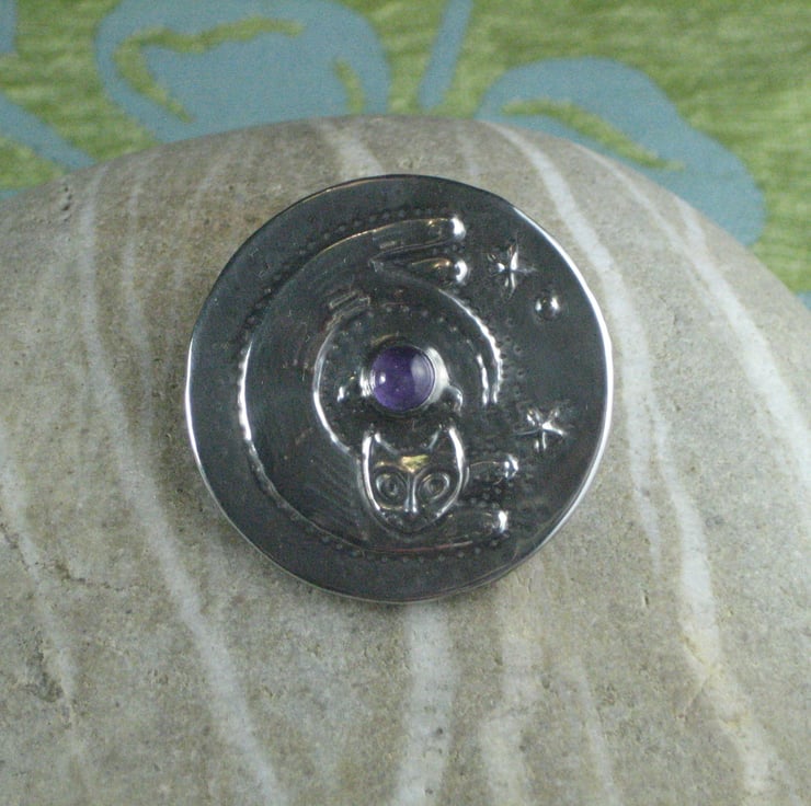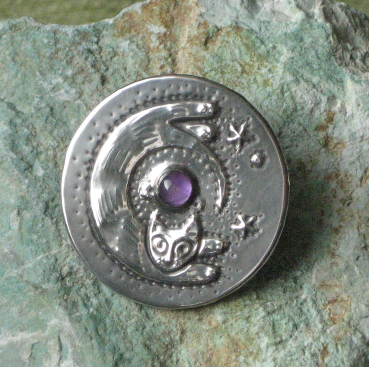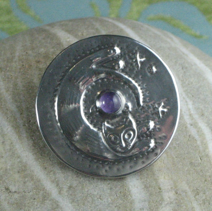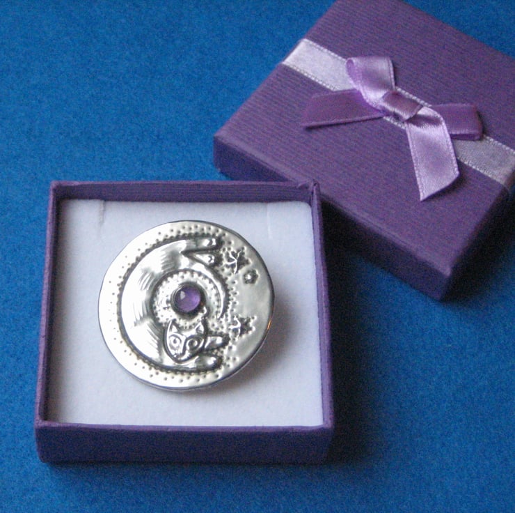 This brooch has been hand-made in shiny modern pewter, and features a genuine amethyst cabochon. It measures 40mm,1.5 ins across and has a 30mm pin with safety catch on the reverse. Comes gift boxed. A great gift for a 10th Wedding Anniversary, Mothers' Day, Valentine's Day or Birthday.