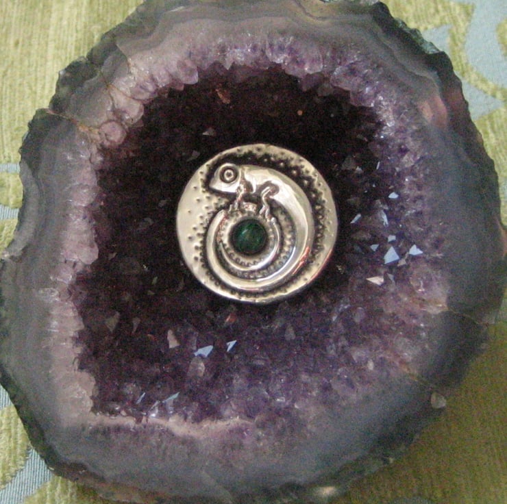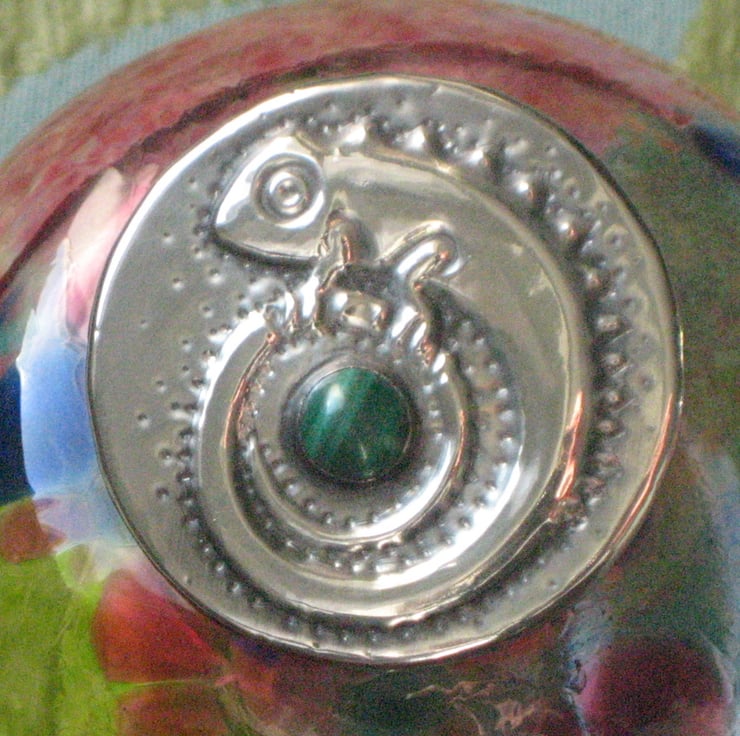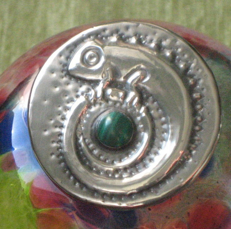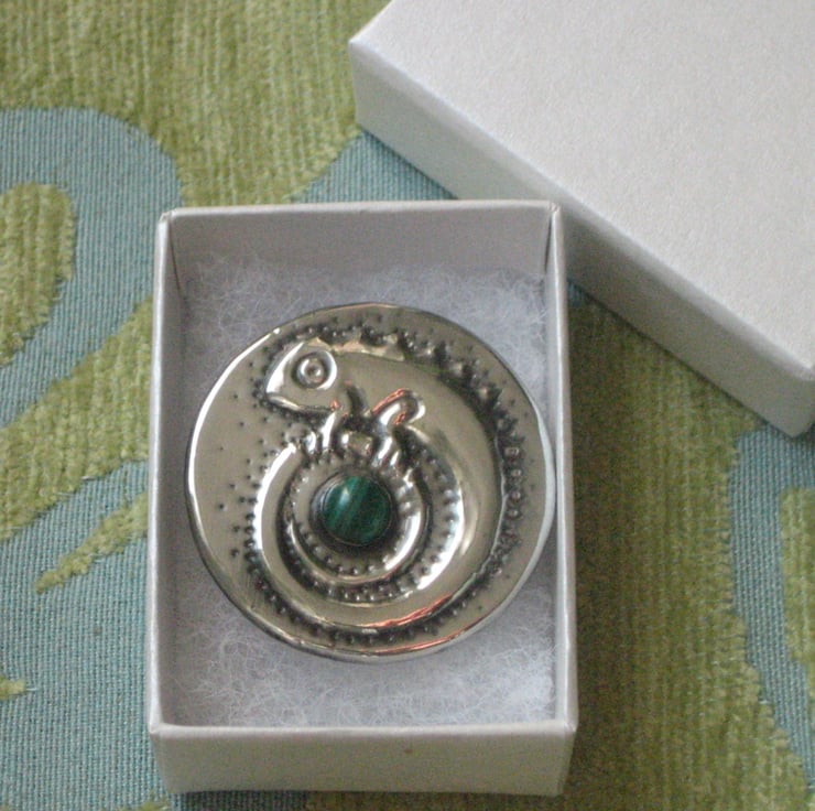 This unique little brooch has been handmade in modern lead-free pewter, and features a malachite gemstone. It measures 33mm (just under 1.5 ins) across and has a 25mm pin with safety catch. Comes gift-boxed.