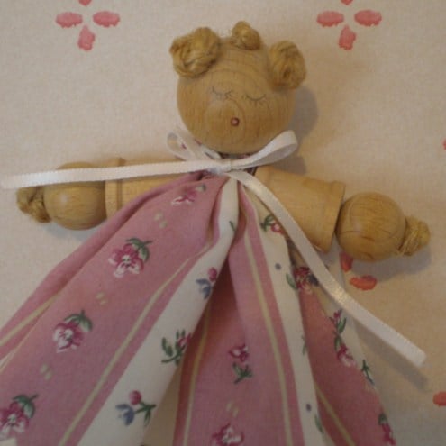 This spoolie doll is made from wooden spools (mini cotton reels) and wooden beads, held together with jute string. She wears a cotton printed, pinked edged dress, finished with a ribbon bow.