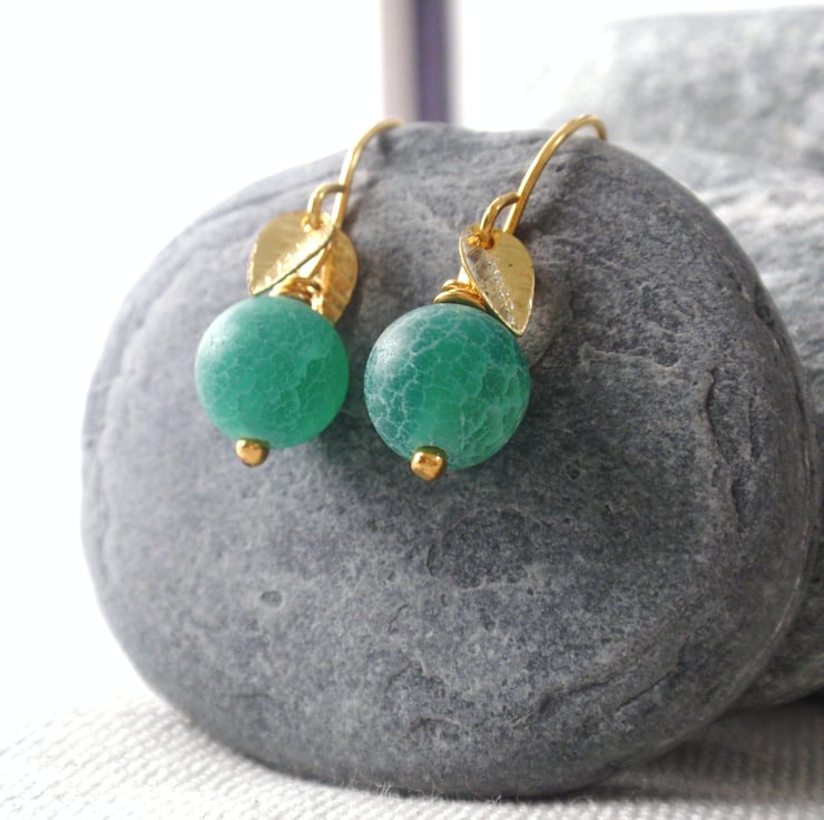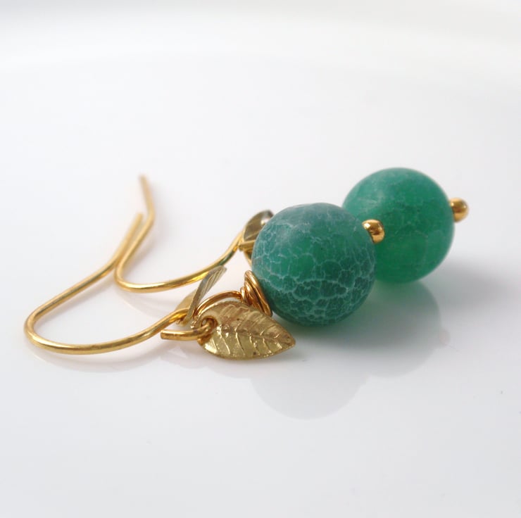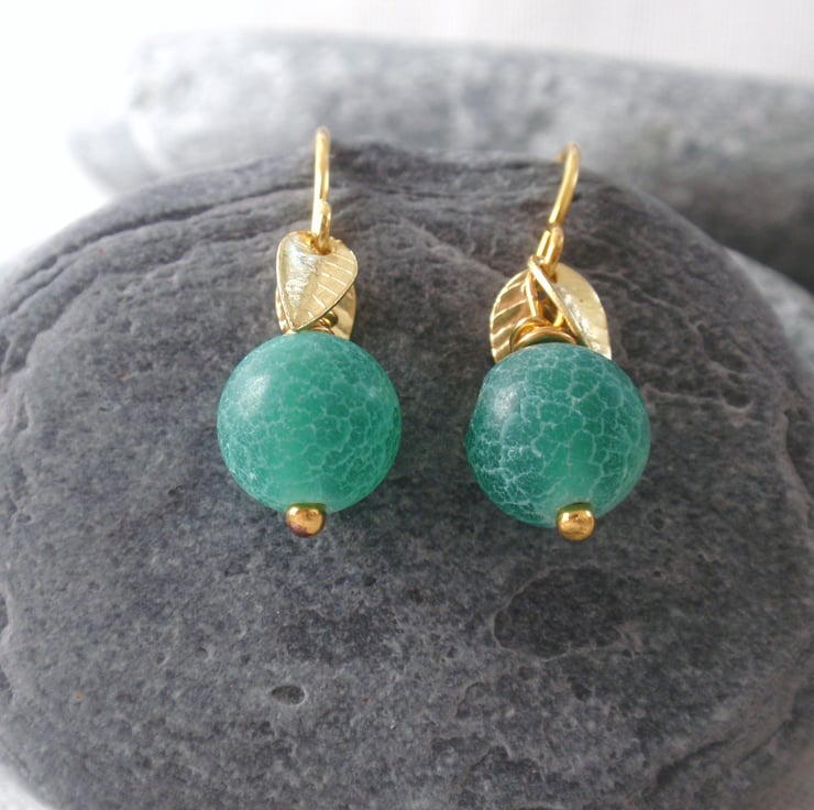 Gold plated earrings with a green fire dragon scale agate bead, a stunning rich deep sea-green colour. Tiny gold leaves (6mm) finish them off beautifully.