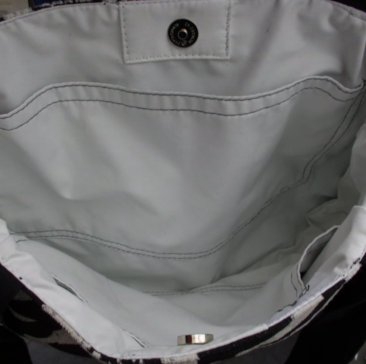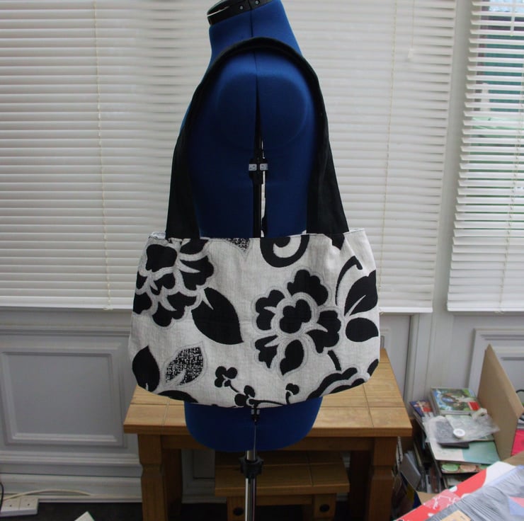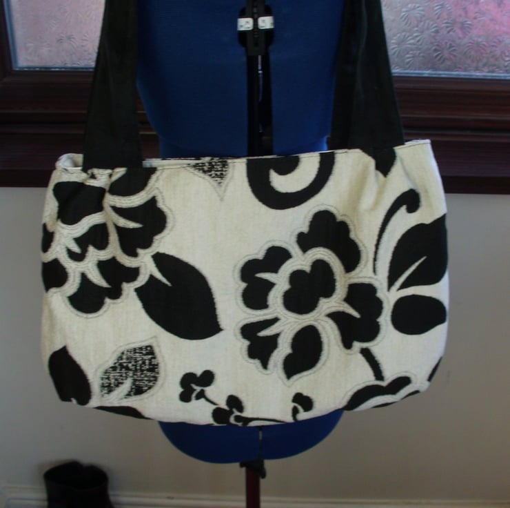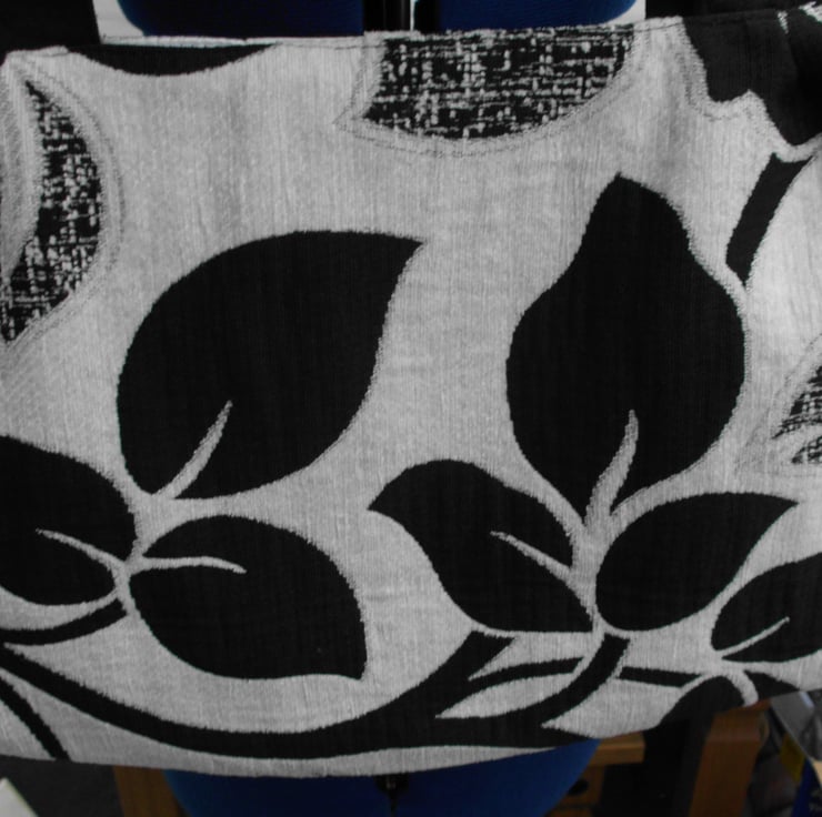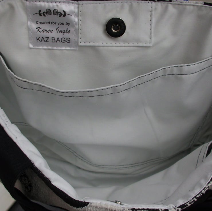 This handbag/tote is made from a soft furnishing fabric with back faux sued handles.The lining is made from a cotton fabric with 2 patch pockets for keys or phone they are edged stitched in black to mach the design and colours of the bag. Has a magnetic clasp .