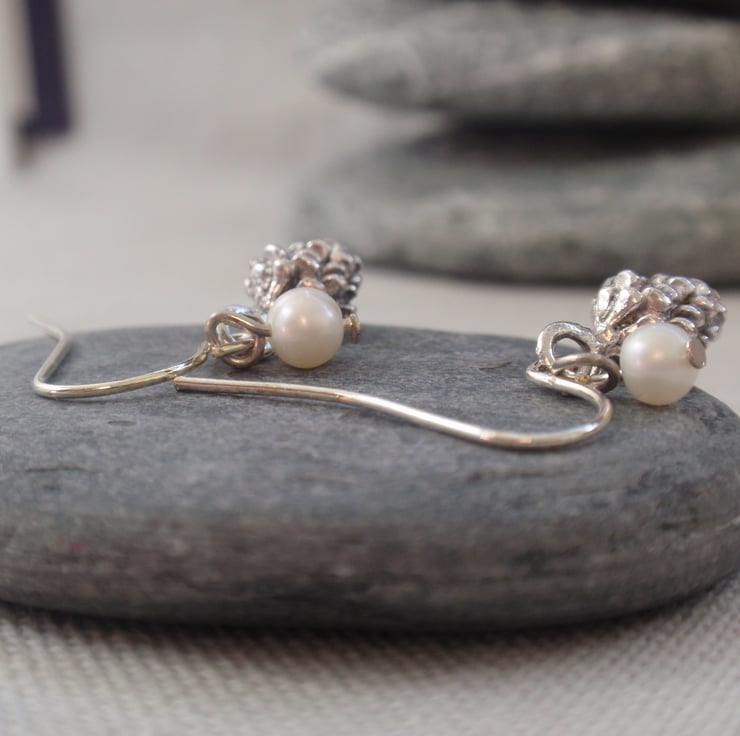 Elegant silver metal pine cone earrings with an ivory freshwater pearl.