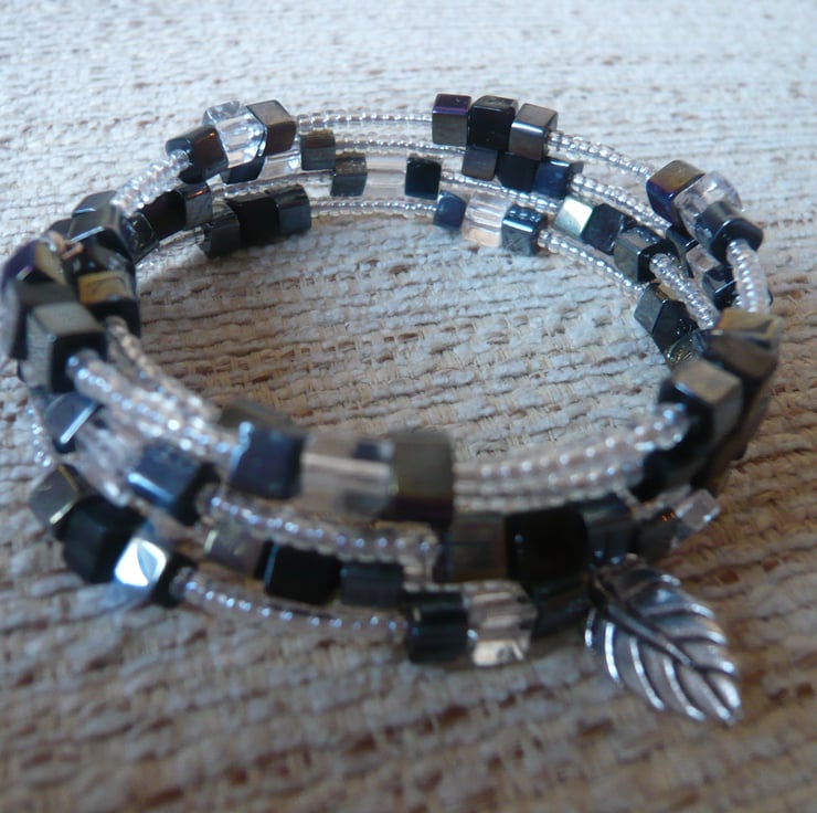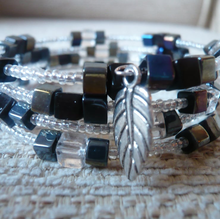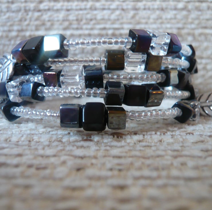 Four coils of dark metallic coloured square beads interlinked with tiny silver seed beeds. Two tibetan style leaf charms are at each end of the bracelet to give it a finishing touch.
