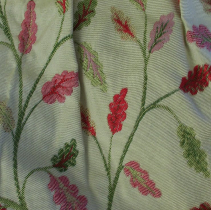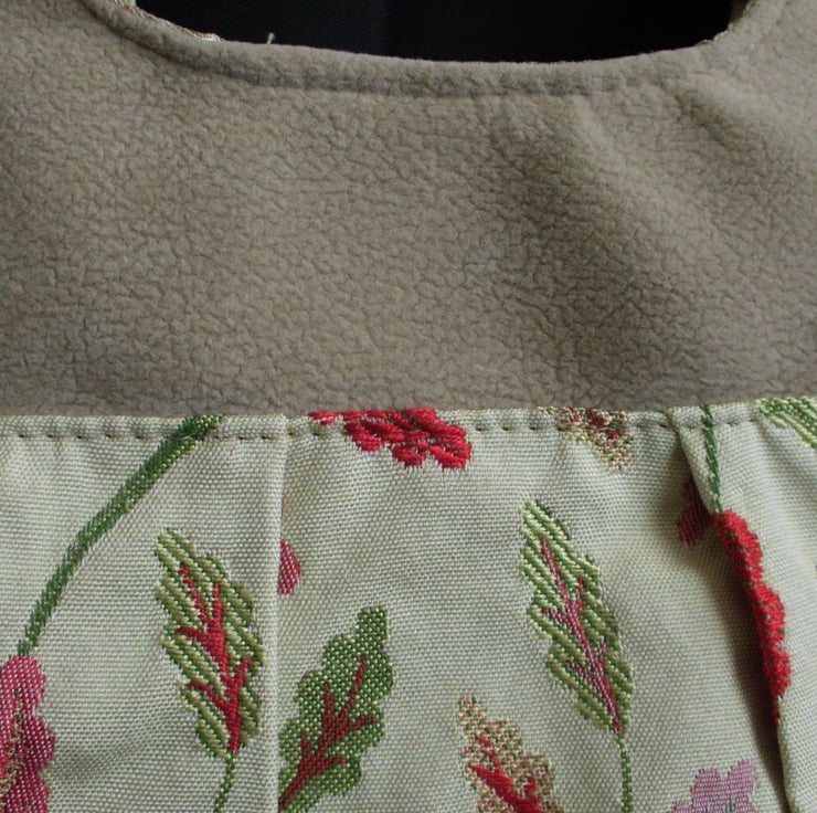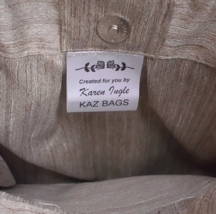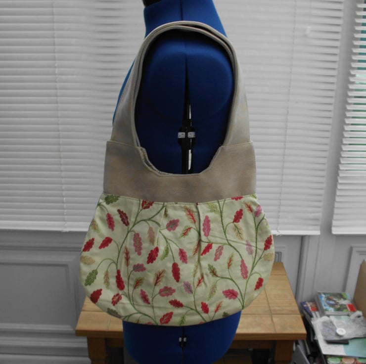 This handbag is made from an end of line heavy soft furnishing fabric with a tapestry design of multi coloured flowers in red ,gold, greens and pinks on a rich cream back ground.
