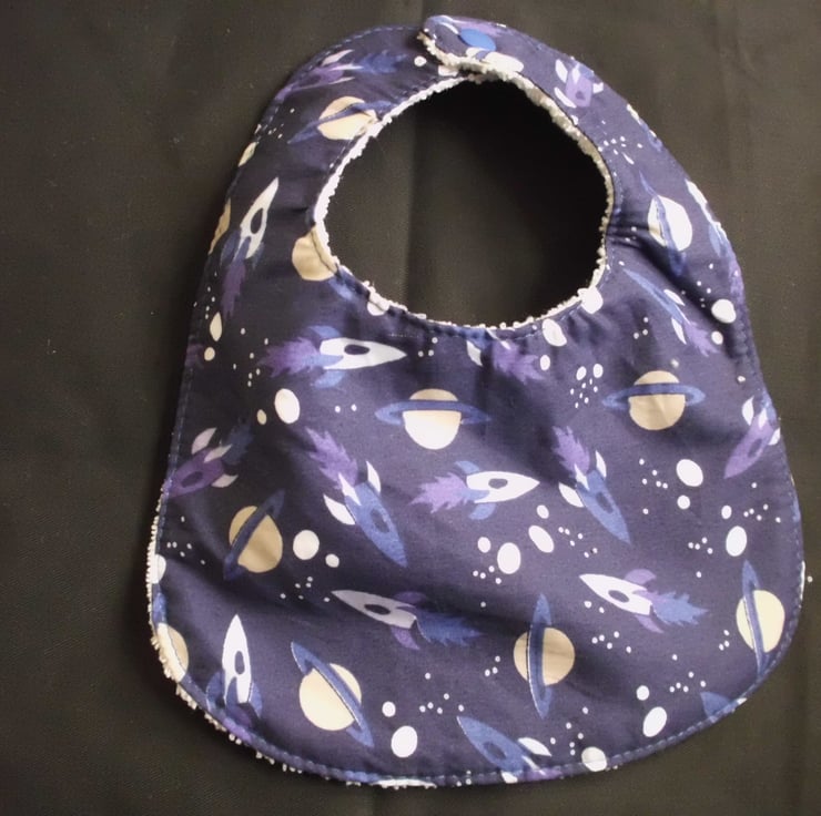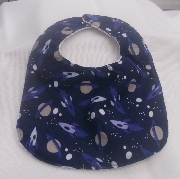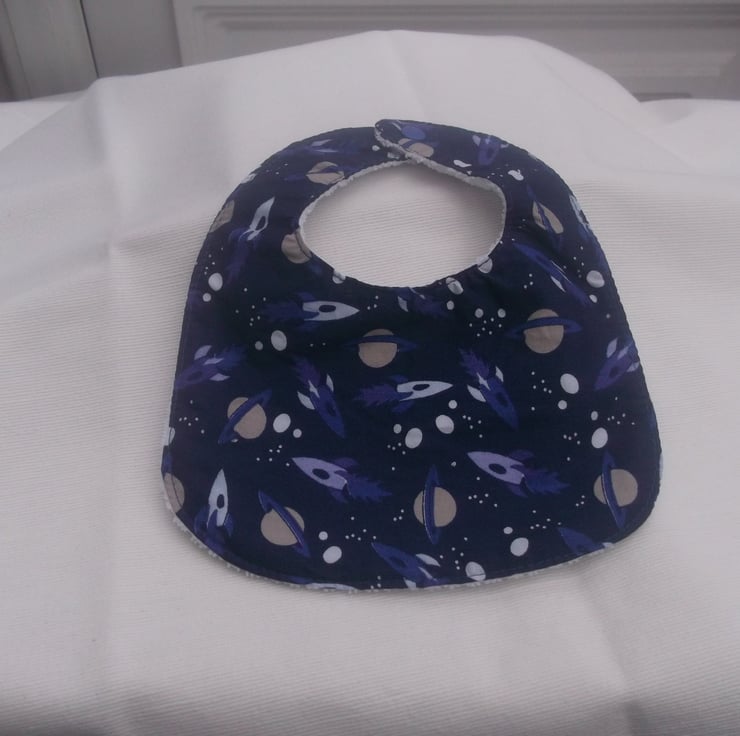 This bib is made from blue cotton cloth with rockets and planets the backing of the bib is made from soft micro fleece the bib is edged stitched round to give detail and strength and finished off with a blue plastic popper for fastening.