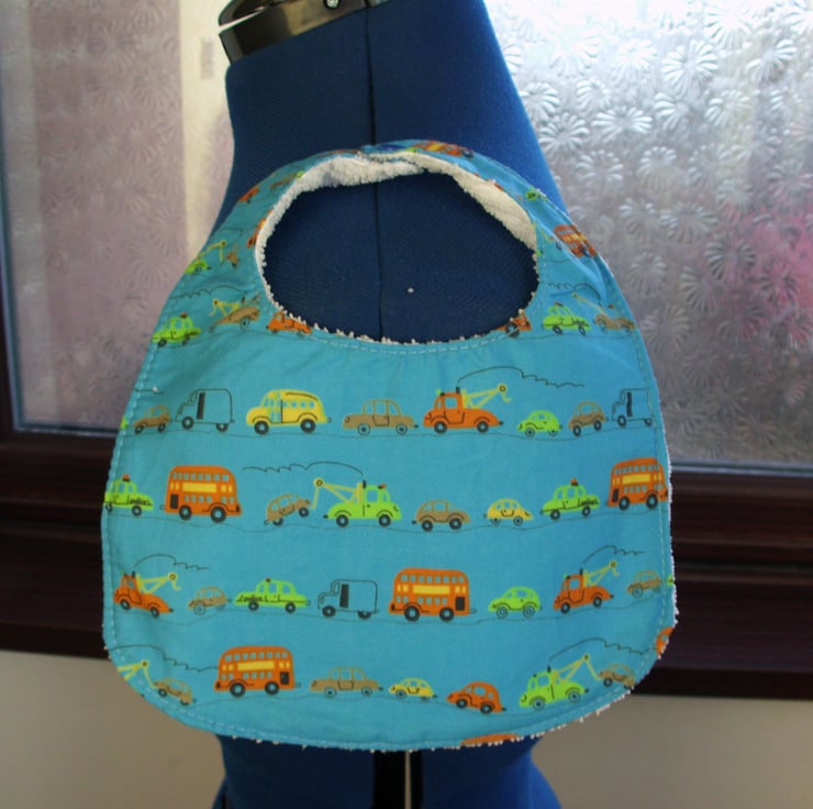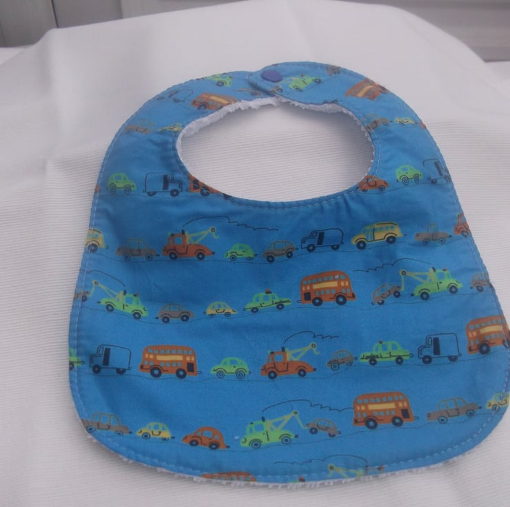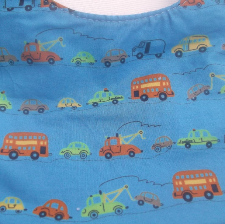 This bib is made from cotton cloth with cars, buses and pick up lorry on a light blue back ground the backing is made from fleese micro cloth to absorb wetness. It is edge stitched round and finished off with a blue popper stud for fastening.