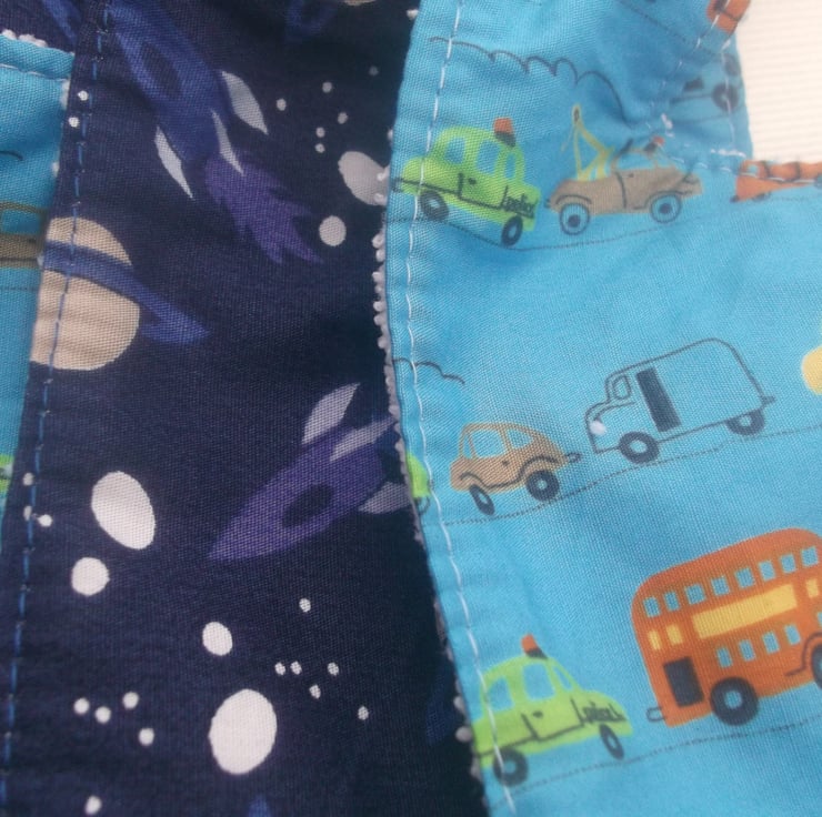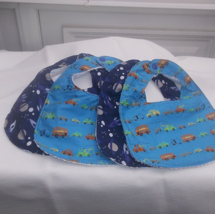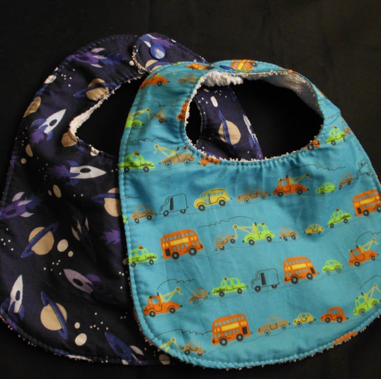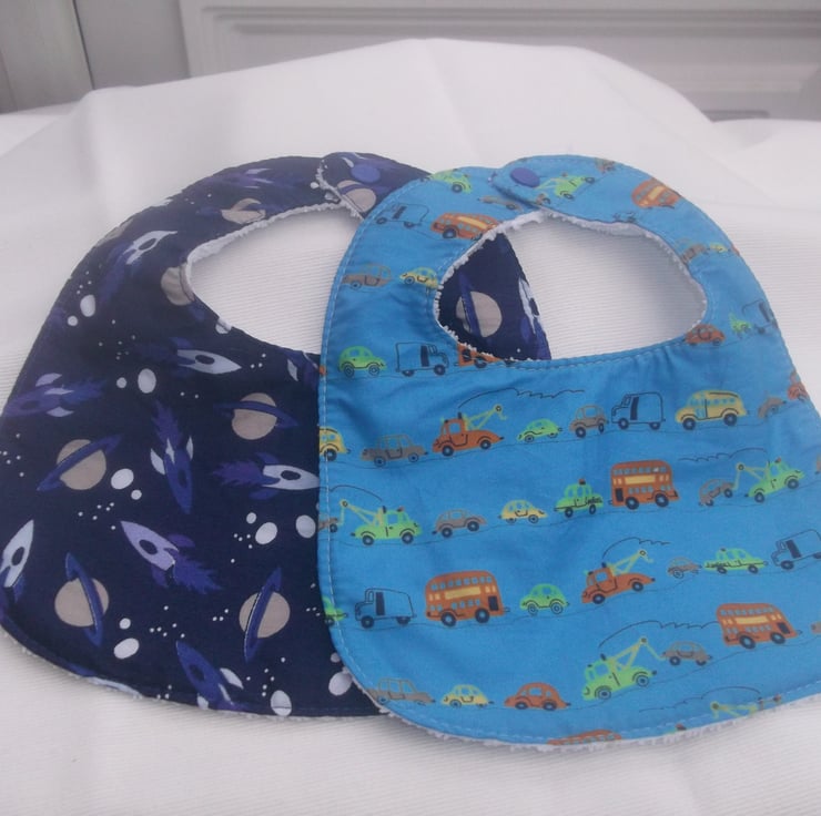 This set of two bibs for a baby boy has one bib with space rockets and planets and the other has cars, buses and pick up lorry .