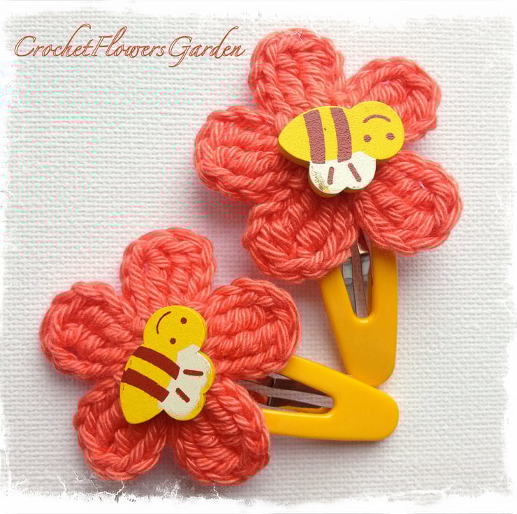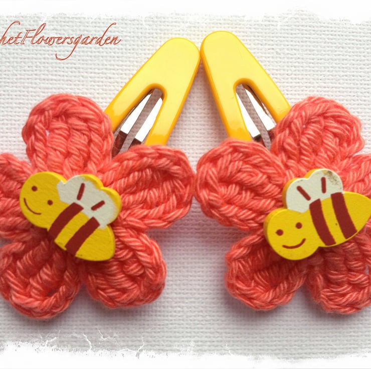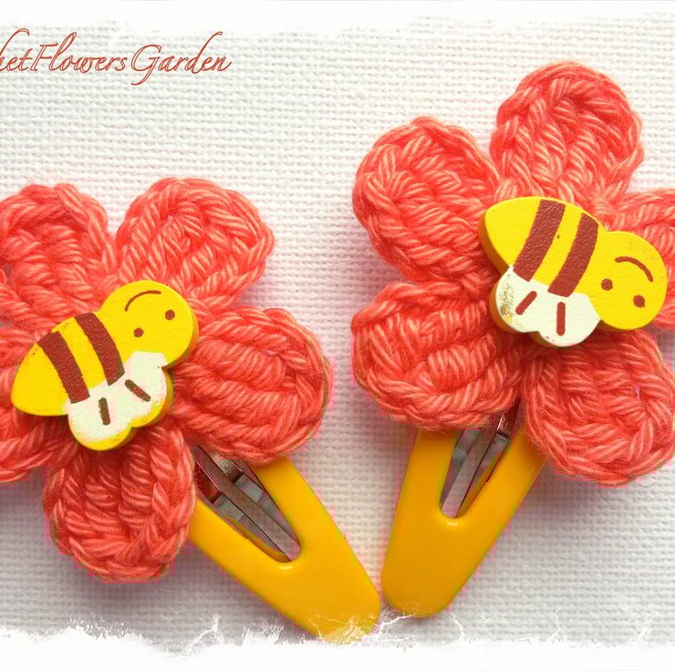 A pair of handmade, gorgeous hair clips with crochet, cotton flowers.