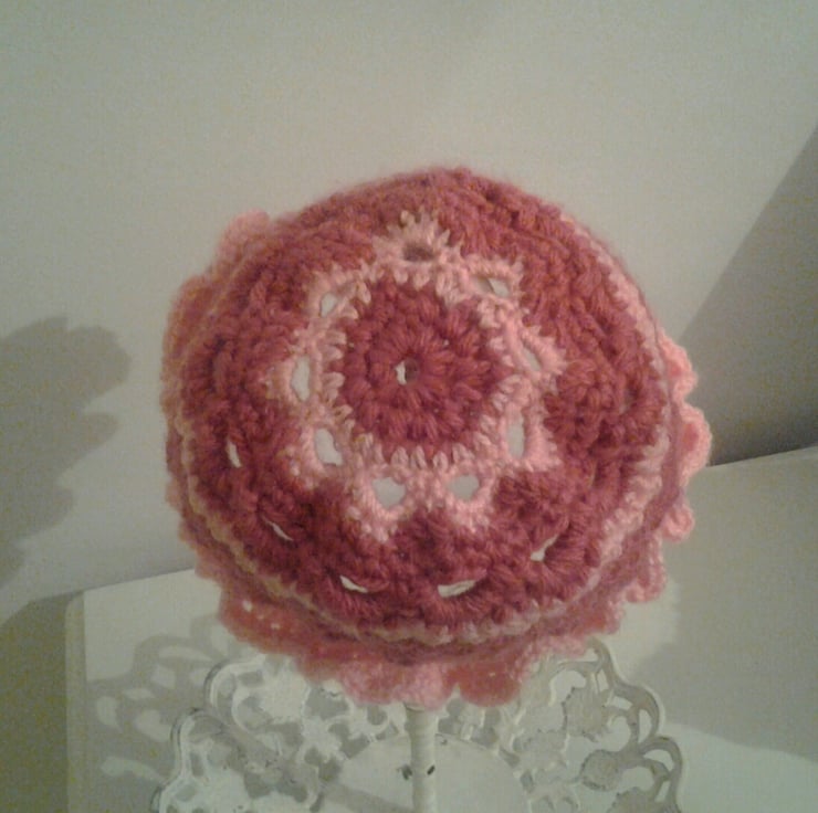 Beautiful crochet hat with button centred pink flower embellishment and ruffled rim is ideal for any little girl that loves pink.
