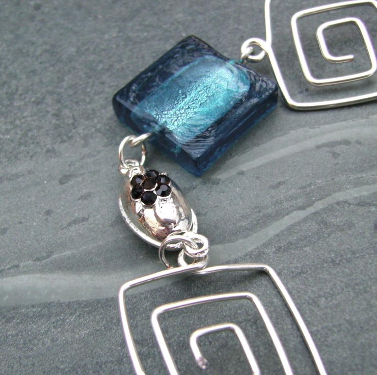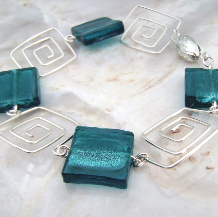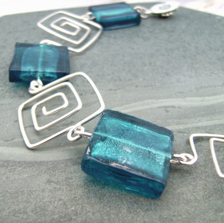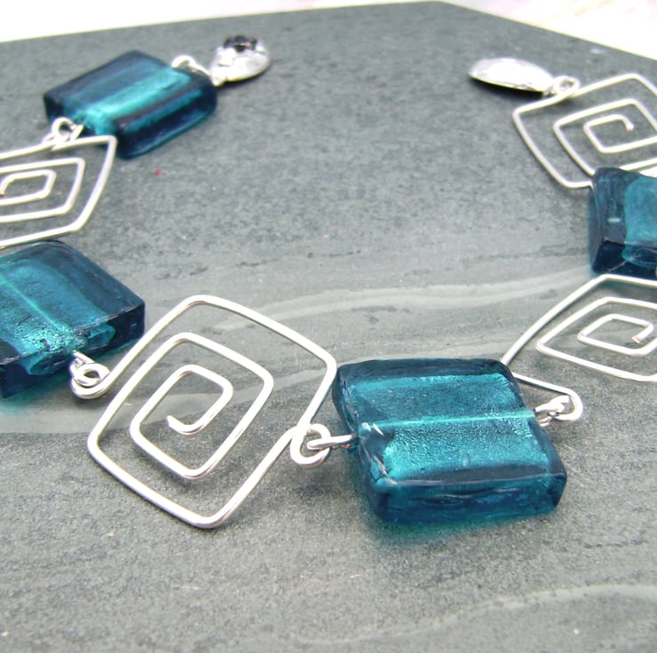 This bracelet has been created using 2cm square teal blue glass beads & silver plated wire shaped & hammered to form square spirals.