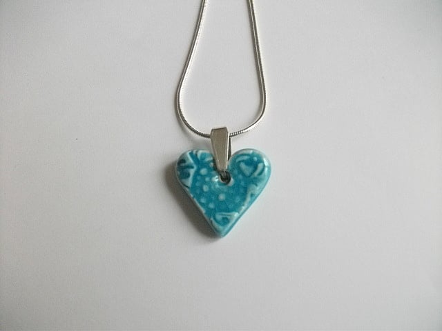 Turquoise small ceramic heart impressed with a vintage lace design, hanging from a sterling silver snake chain on a sterling silver pronged bail.