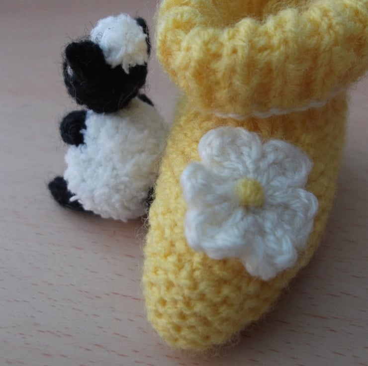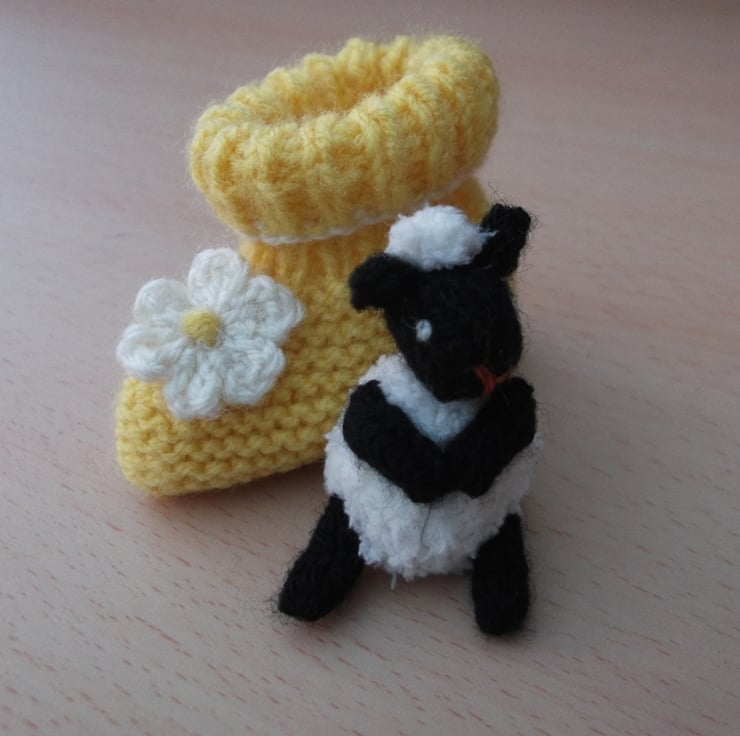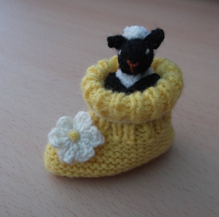 Hand knitted sheep in a baby boot. The sheep is about 5 cm in sitting height, the boot is 7 cm. They are both knitted with yarns which are mix of wool and synthetics. The sheep's body is knitted with fluffy snow flake yarn and stuffed with wool fleece.