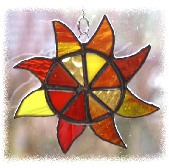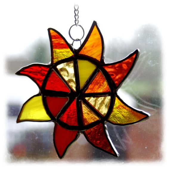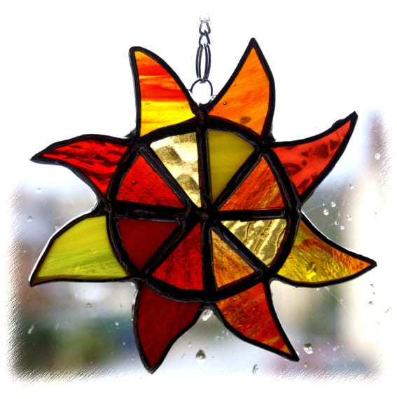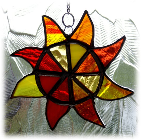 A silver coloured little chain is securely attached by solder to the top of the Sun with a little ring to hang it.