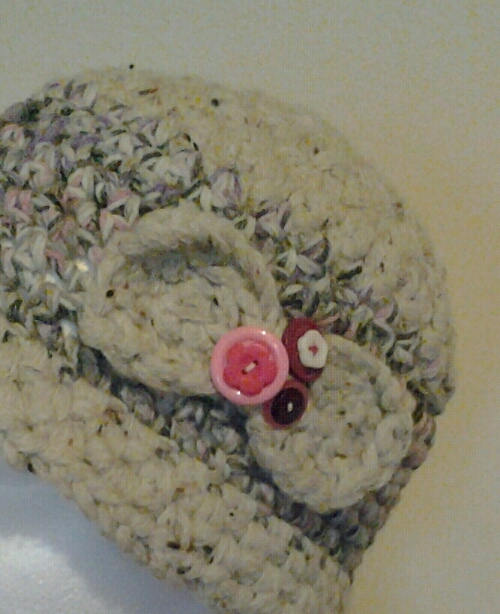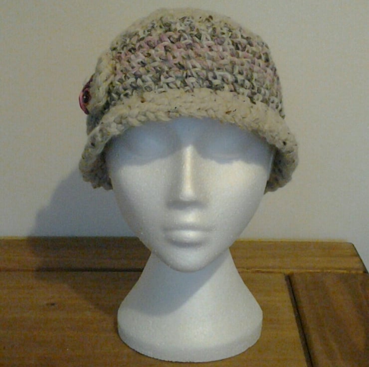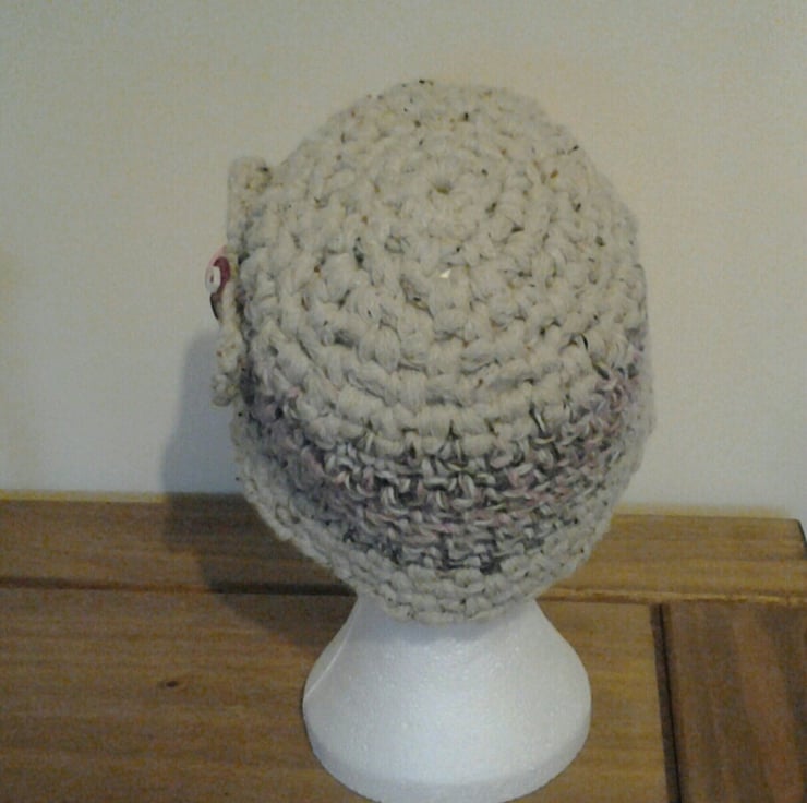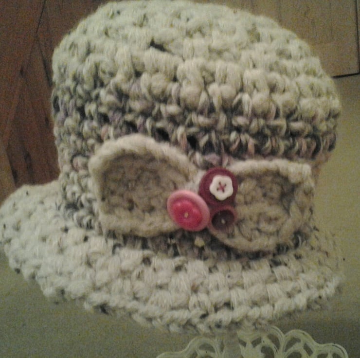 This Beautiful ladies vintage style hat with button embellished bow has been crocheted using two types of lovely thick wool, one cream and the other a mixed colour wool with pink, lilac and grey strands. This hat will fit a head size upto 55cm approx and is very soft and warm.