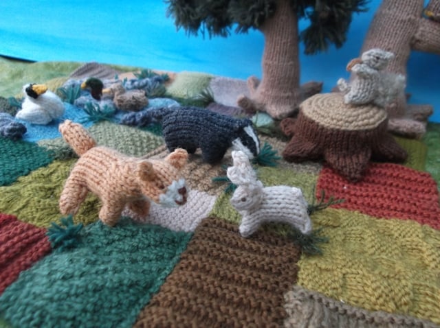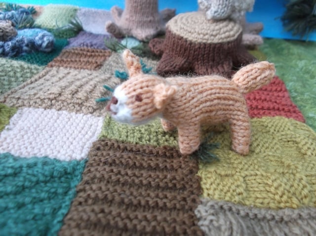 Knitted fox. It is knitted with 100 % wool yarn and stuffed with wool fleece. The body is about 6 cm plus tail 3 cm. No wire or glue is used.