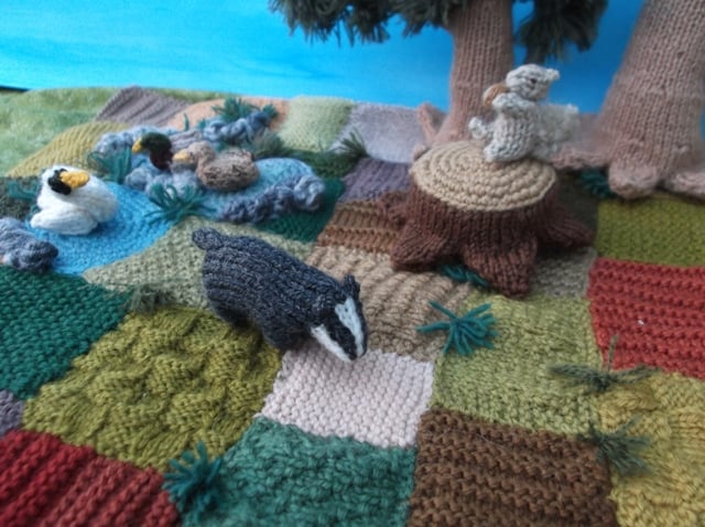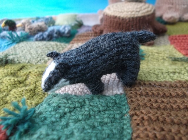 Hand knitted badger. It is approx 6 cm long and stuffed with wool fleece. The yarn used is mix of wool and synthetics but has high content of wool and soft to the touch. No glue or wire is used.