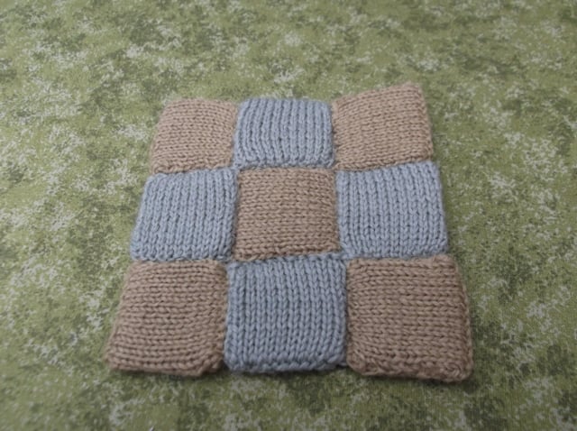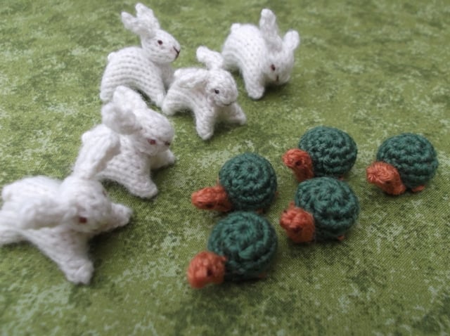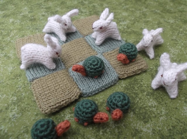 Play noughts and crosses with knitted hare and tortoise. Everything is knitted. The set comes with 5 knitted hares and 5 knitted tortoise. The board is a patchwork of knitted squares. Each square is knitted individually, encased a cardboard and sewn together. The board measures 11.5 cm x 11.5 cm (4.5 in x 4.5 in). Hares measures 3 cm long, tortoise 2 cm.