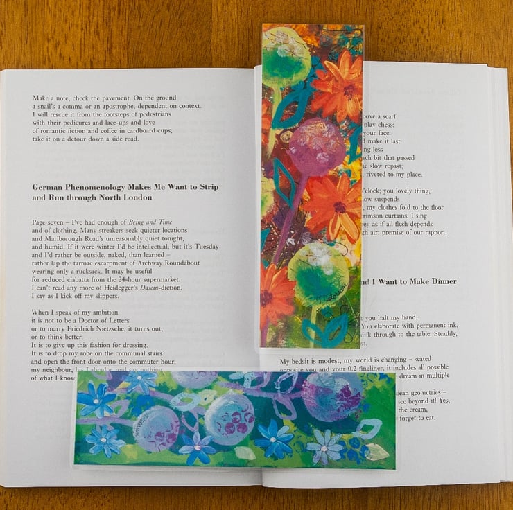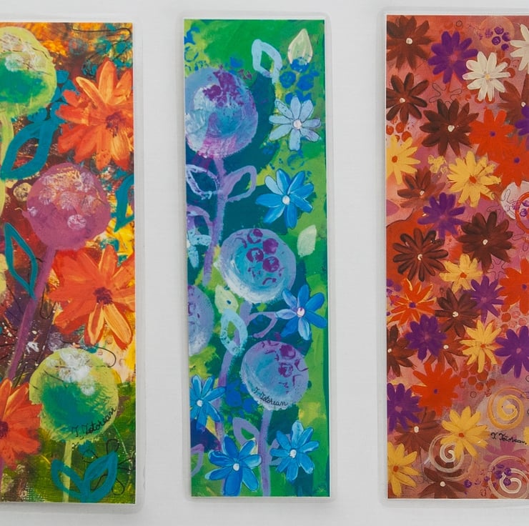 Bookmarks home made using laminated prints after after original paintings, set of three, flower theme.