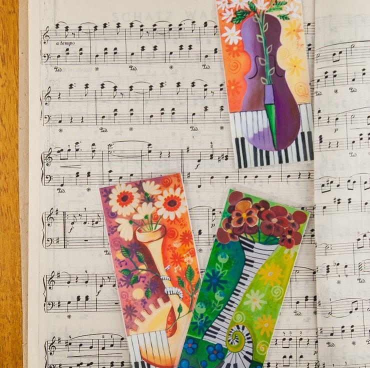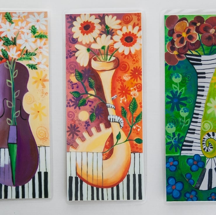 A set of three bookmarks created at home using laminated prints after some of my original paintings.