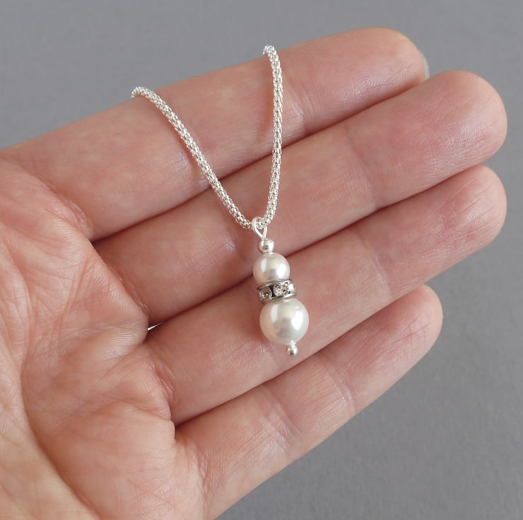 An elegant glass pearl and crystal drop hangs from a Sterling silver corb chain. The lustre of the pearls combined with the sparkle of the white sparkling crystals makes for a gorgeous elegant piece, which is timeless in design. This pearl teardrop necklace would be ideal for a bride or her bridesmaids. It would also look stunning with a little black dress.