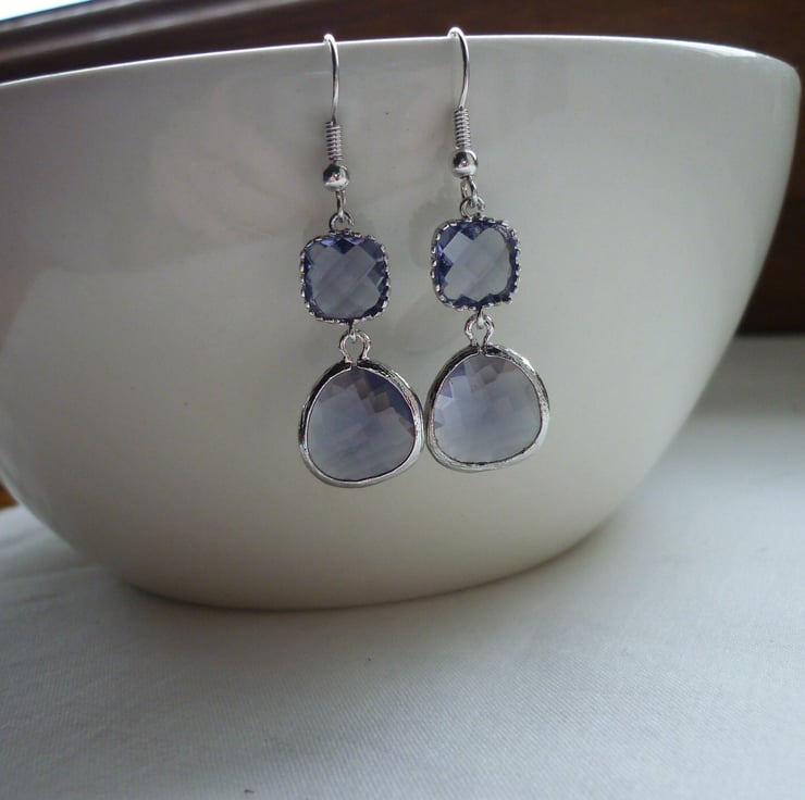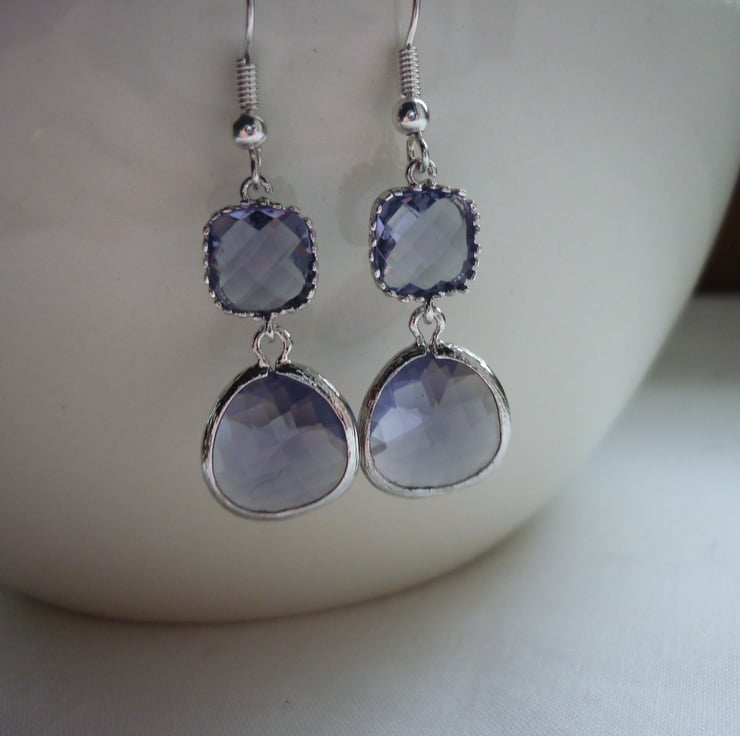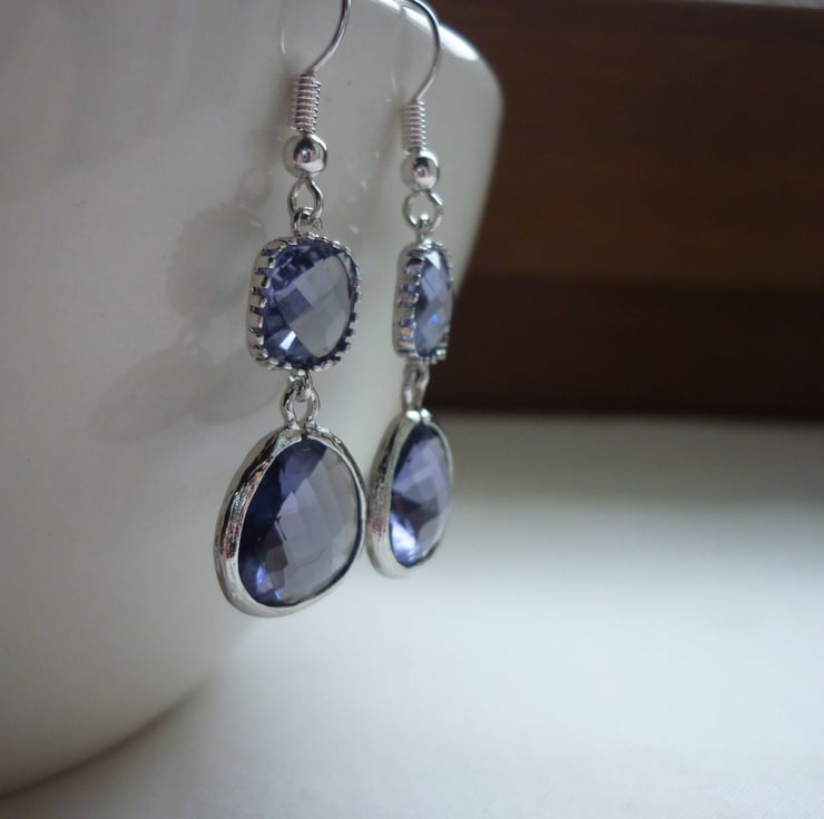 THE EARRINGS HAVE BEEN MADE WITH SILVER PLATED FRAMED ROSECUT FACETED STONES IN TANZANITE IN TEARDROP AND CUSHION SHAPE AND FINISHED WITH SILVER PLATED EAR WIRES NICKLE FREE.