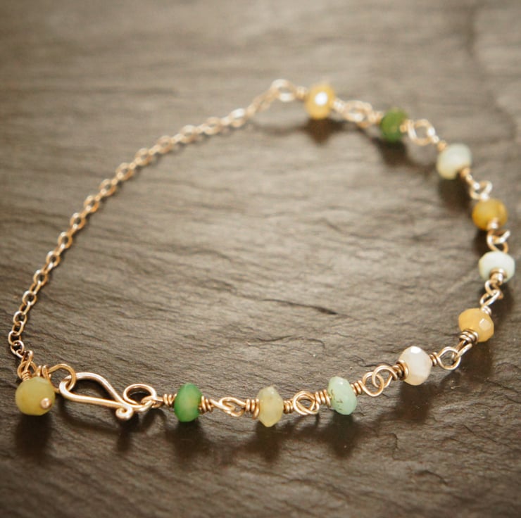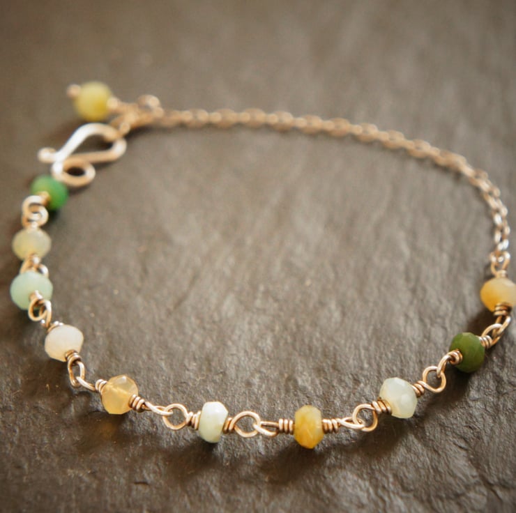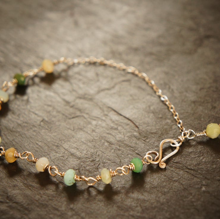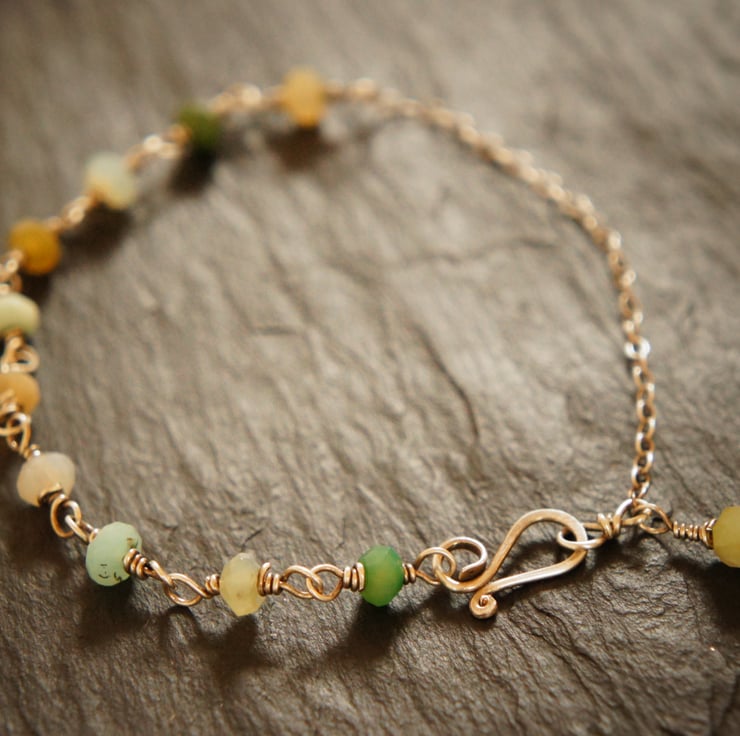 A delicate bracelet made with pale faceted Green Peruvian Opals finished with a handmade sterling silver clasp.