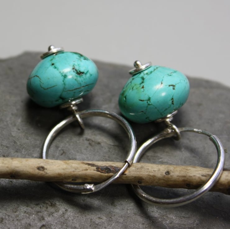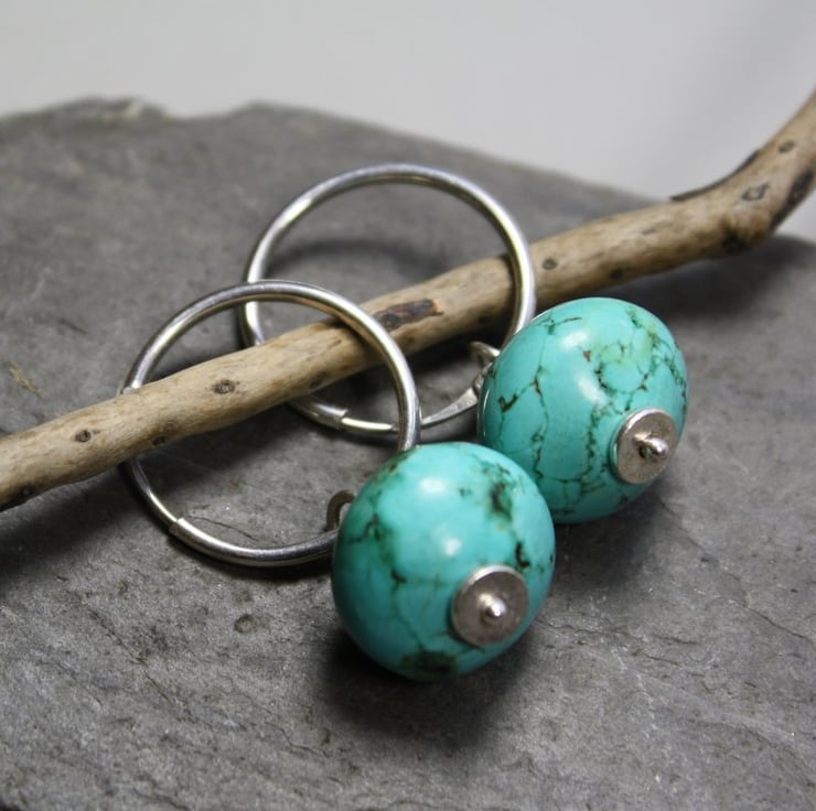 15mm Plump matched turquoise beads are combined with silver headpins and washers. Hung from sterling silver creole hoops or hooks.