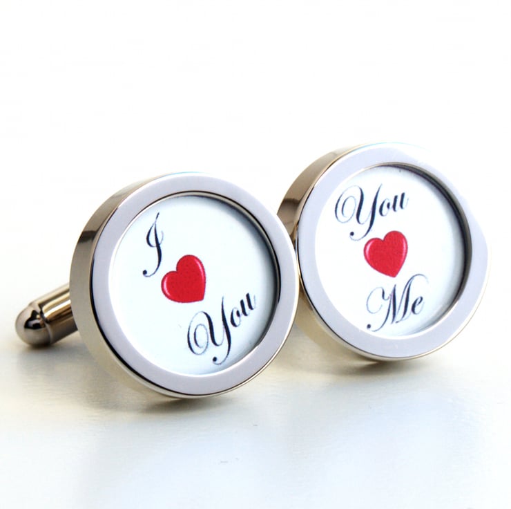 I heart You and You heart Me Cufflinks in classic script black lettering on a white background. Romantic cufflinks, perfect for the man in your life for weddings, valentines or just because.