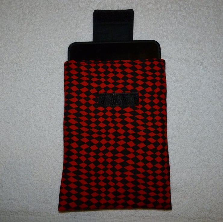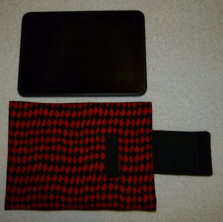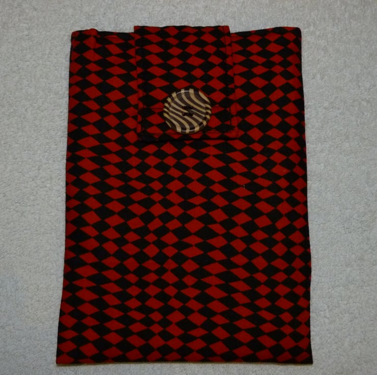 This eye catching red and black harlequin print cotton fabric has been hand made into a useful cover for your Kindle Fire, or other 7" tablet device. It is lined in plain black cotton fabric, and is padded with cotton wadding to protect your device. There is a fabric flap, with Velcro fastening, and a decorative button stitched on the flap.