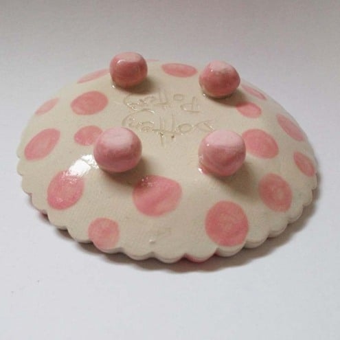 This brightly coloured plate is the perfect size for an individual cupcake or muffin - it has pink spots all over it and matching feet!