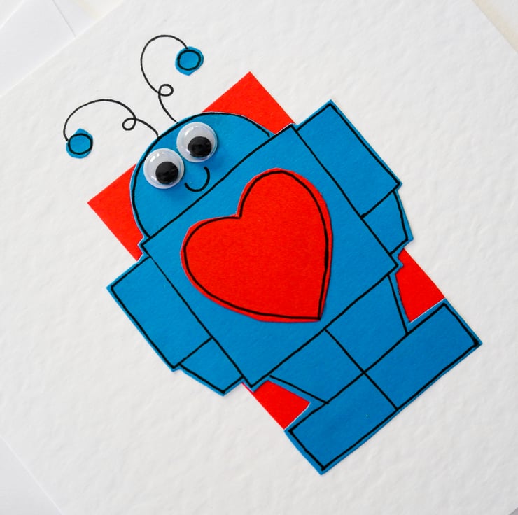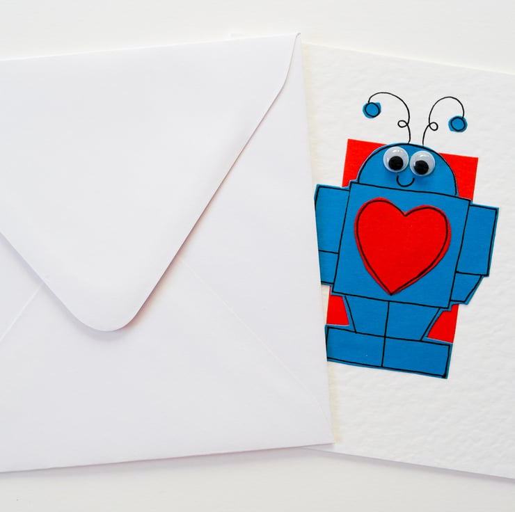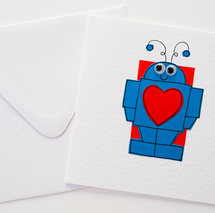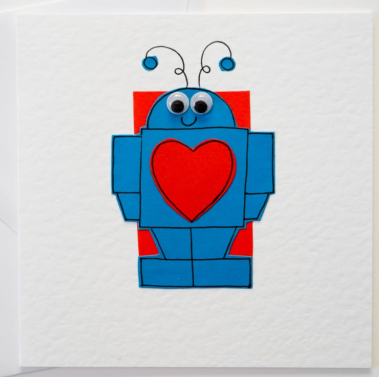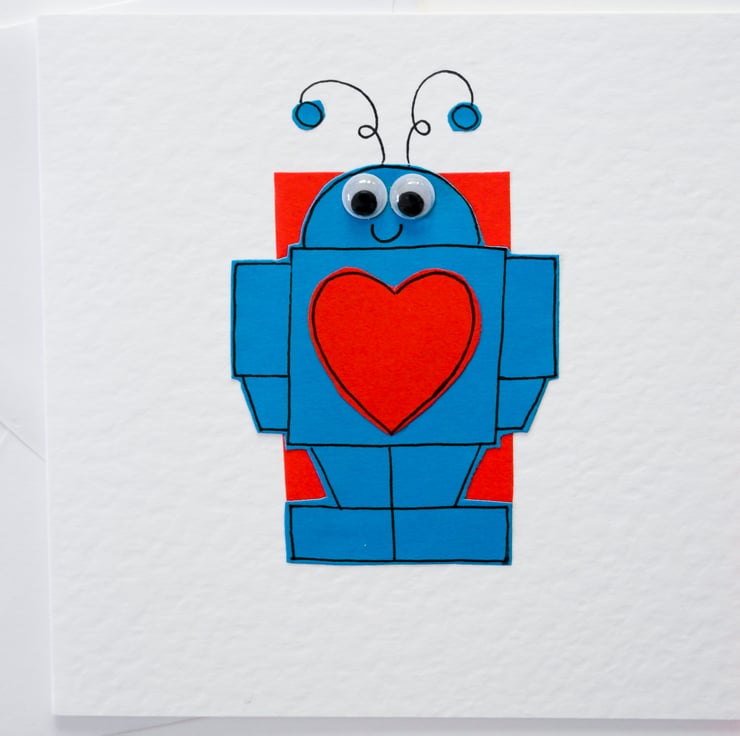Handmade Robot Valentine's Day Greeting Card. A great card for the geek in your love. Ideal anniversary card, birthday card for your boyfriend, husband, partner, wife or girlfriend. What shows your love like a big blue Robot.