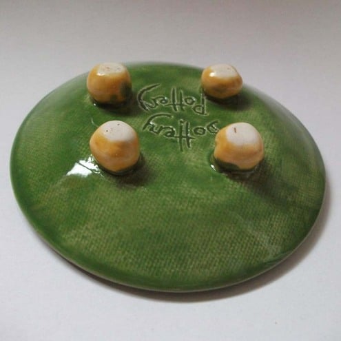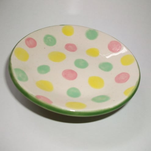This brightly coloured plate is the perfect size for an individual cupcake or muffin - it has pink, green and yellow spots all over it and matching yellow feet!