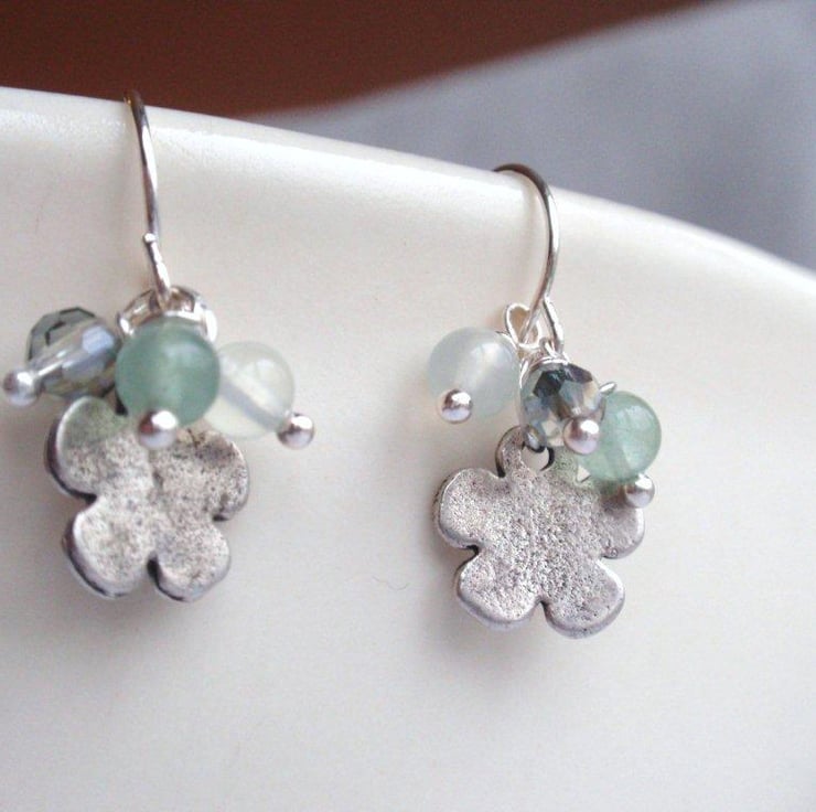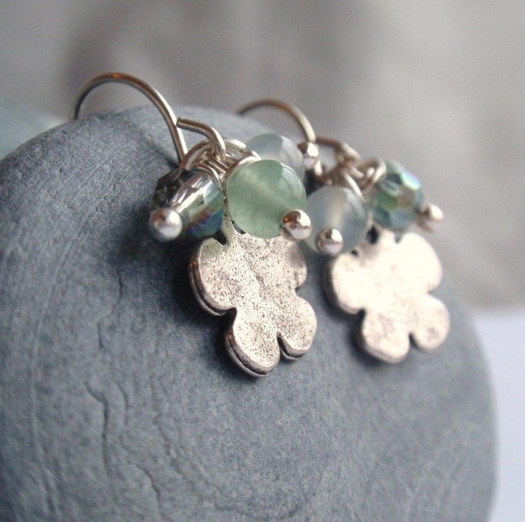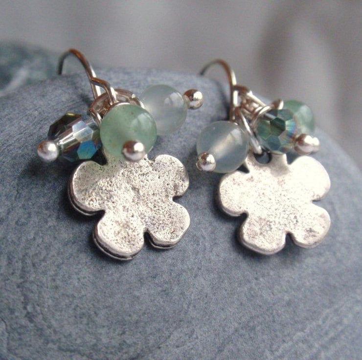 Feminine flower earrings with green jade and aventurine gemstones (4mm) and crystals on a silver plated hook. the flower is 1cm diameter and slightly antiqued silver tone metal. A pretty, subtle clustered effect.
