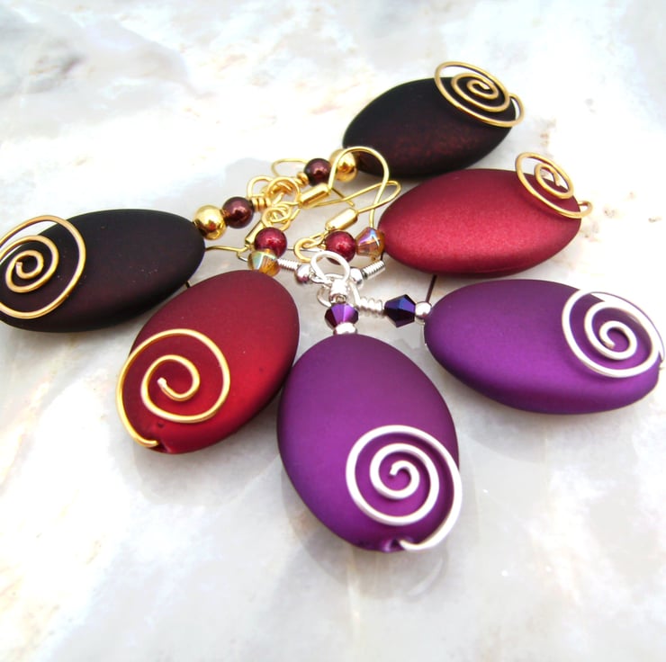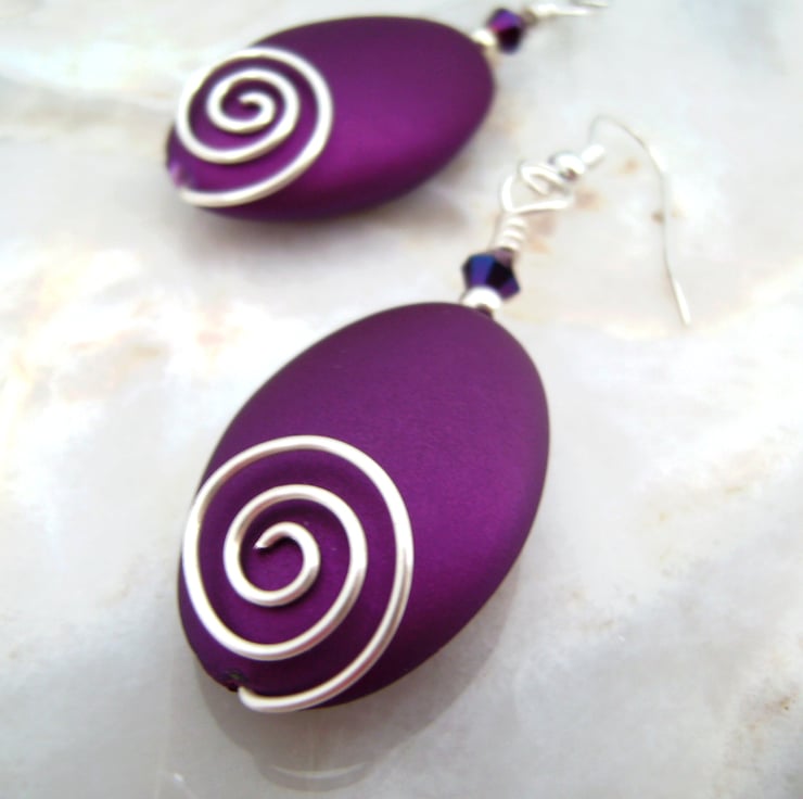 This pair of earrings have been created using silver plated wire shaped into spirals & attached to purple 3cm x 2cm oval acrylic beads & completed with glass & silver plated beads. They are hung on silver plated wire ear hooks.
