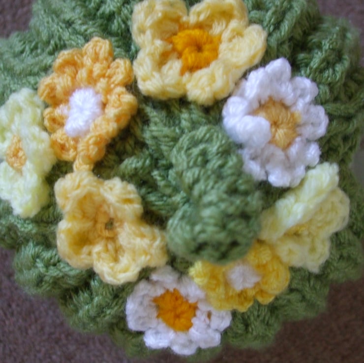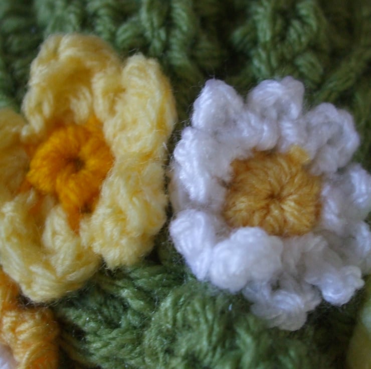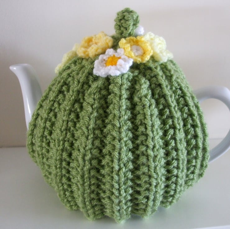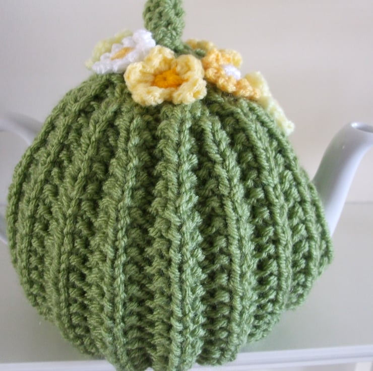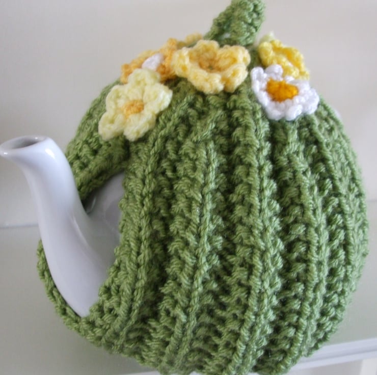 Hand knitted tea cosy in green yarn used double for extra thickness. Decorated with crocheted primroses and daisies.