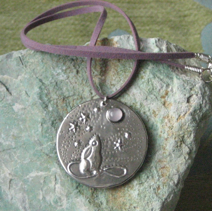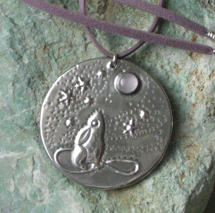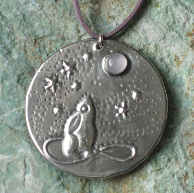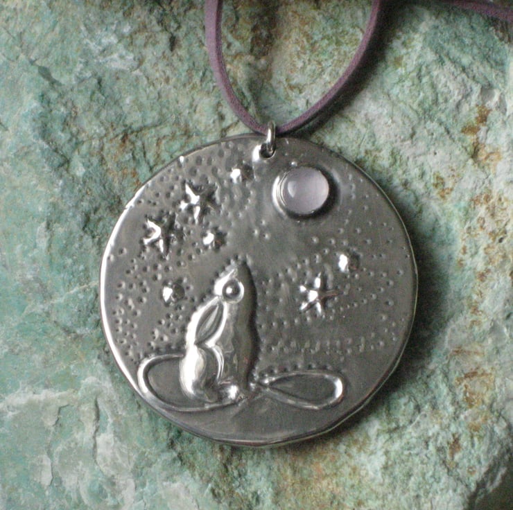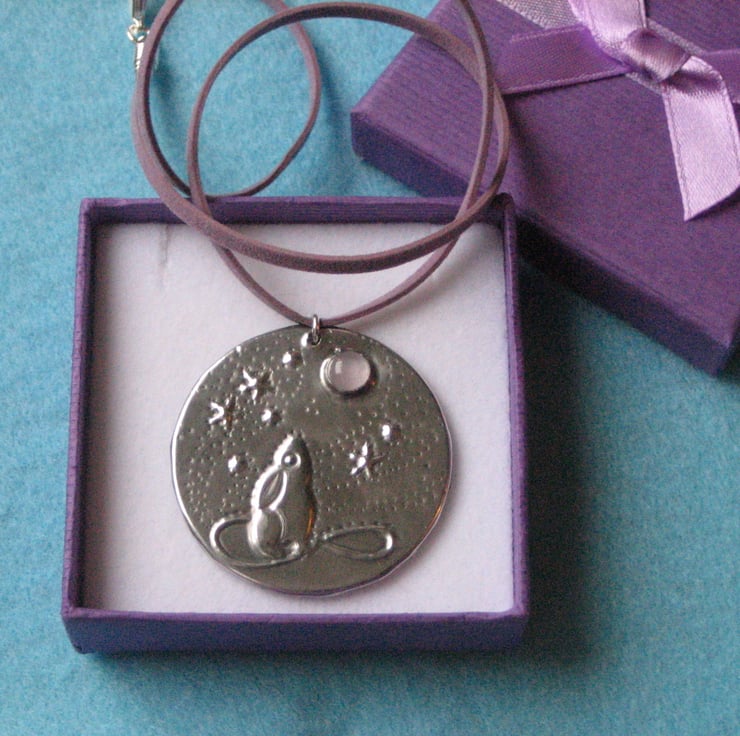 This lovely pendant features the legendary hare gazing up at a moon of genuine rose quartz. Measuring 38mm(1.5)across, it has been handmade in modern lead-free pewter, and comes on a simple suede effect lace (45cm long) with lobster clasp. A great gift for a 10th Wedding Anniversary, Mothers' Day, Valentine's Day, Birthday or Easter.