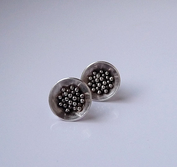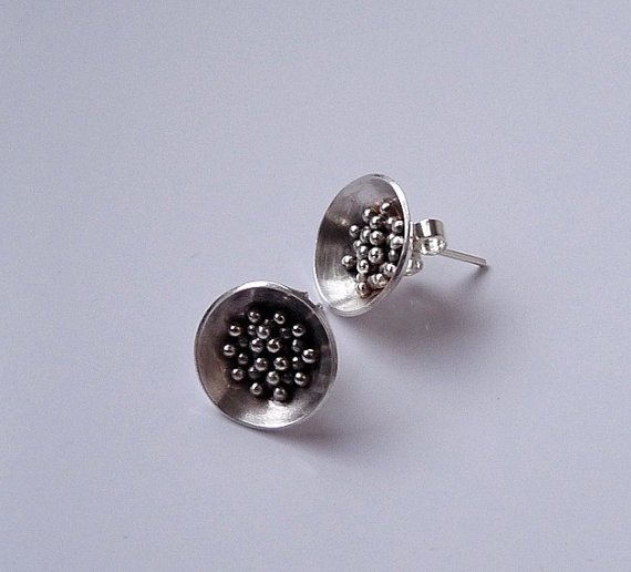 These domed earrings are made of sterling silver, using an ancient technique called granulation. Each ball has been formed individually and then soldered to the piece.
