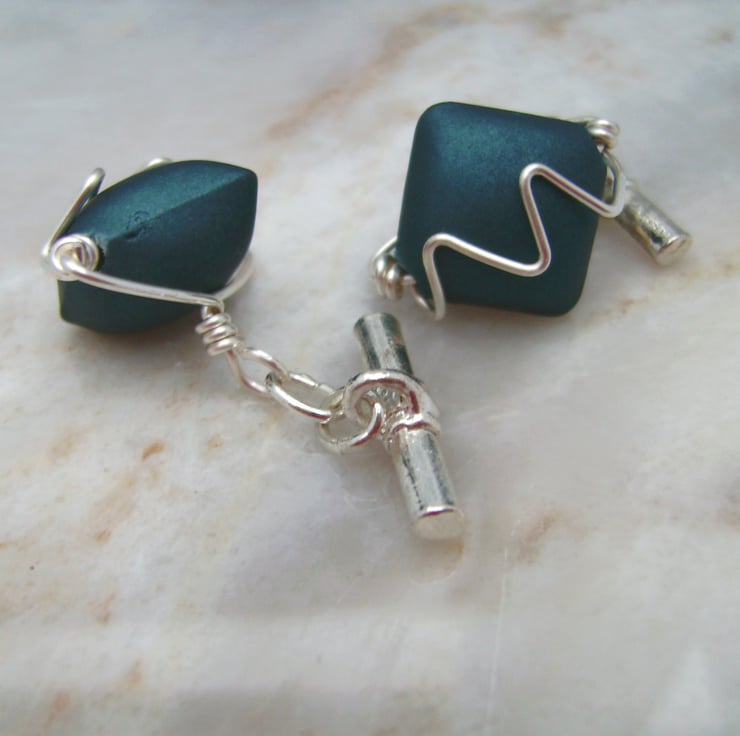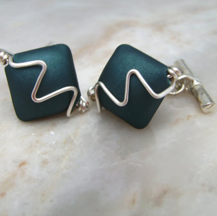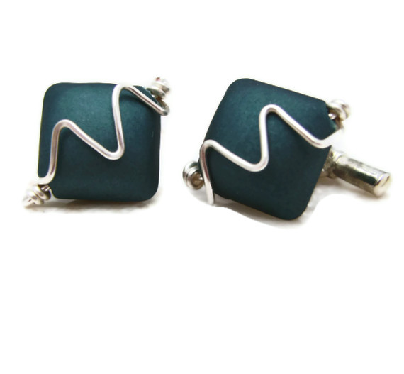 This pair of gents cufflinks has been created using 12mm square coated acrylic beads in teal blue & then silver plated wire shaped & hammered to give the sound wave effect on the top of the cufflinks. They are attached to silver plated cufflink bars & will be sent in a gift box.