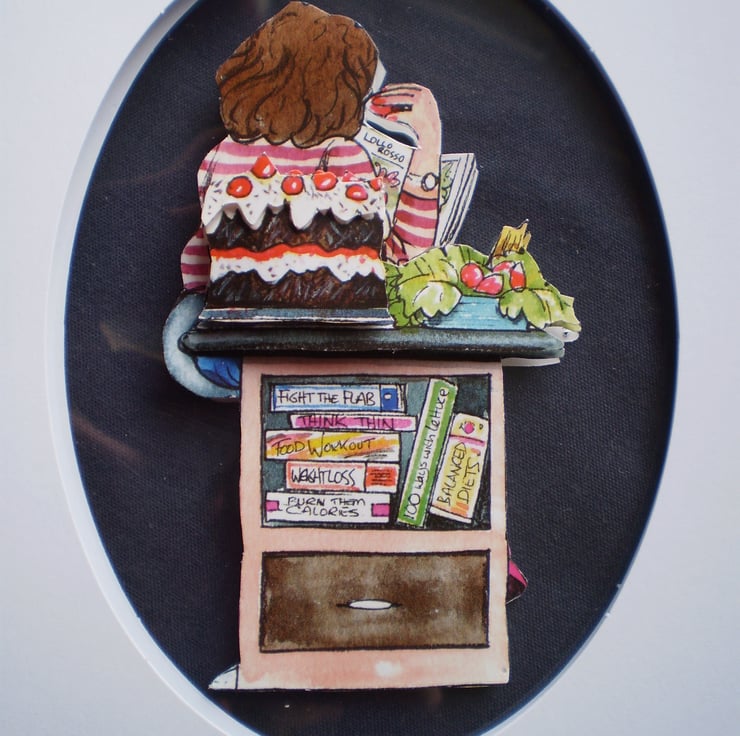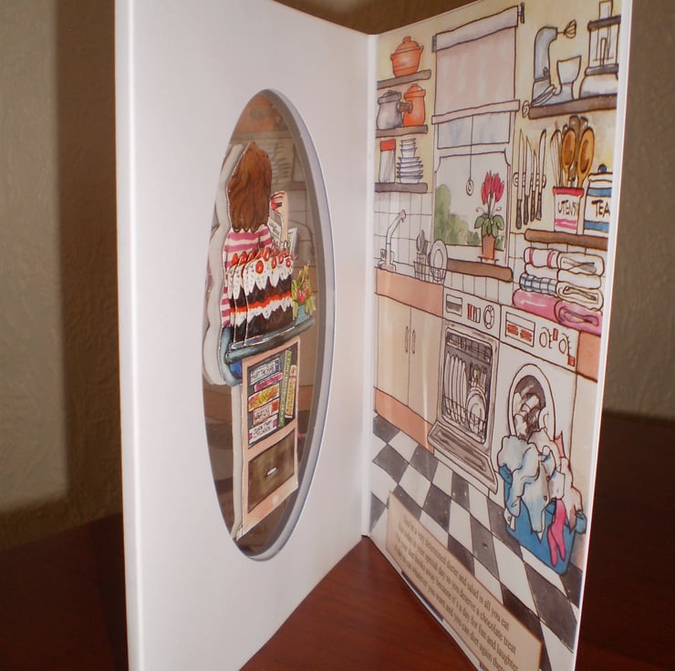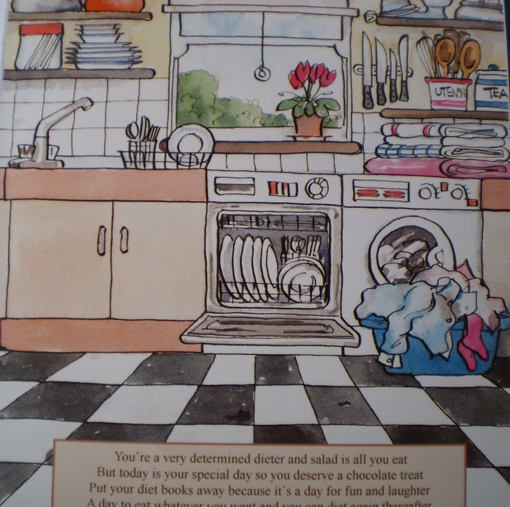 A decoupage lady trying her best to diet! She is on a card measuring 150x170mm (6x7in). She is mounted on clear acetate so that when you look at inside of card you can see her rear view (note the gateau!). Inside has a backing paper and some words