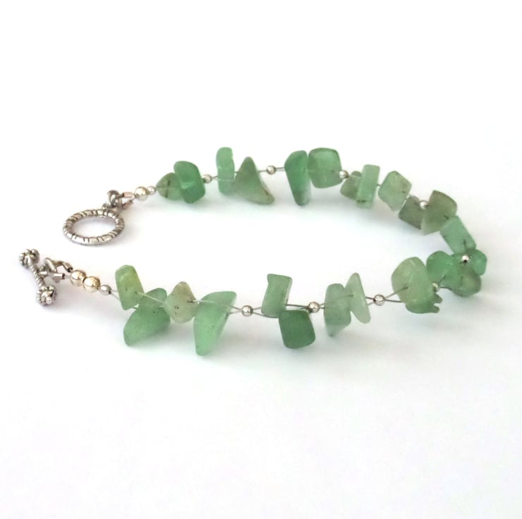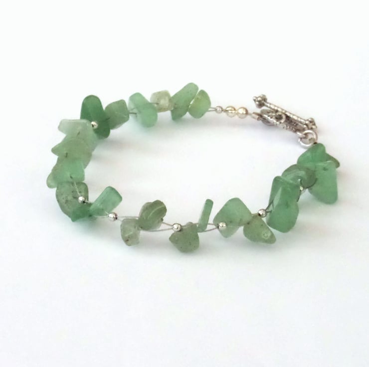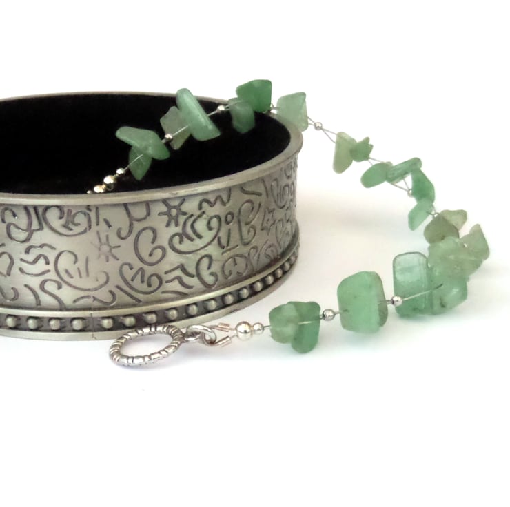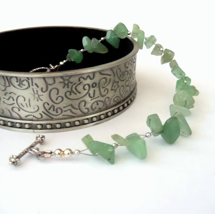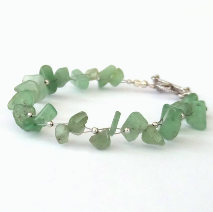 I have woven the chips, using tiny silver-plated beads between the aventurine chips, and finished it with a simple toggle clasp.