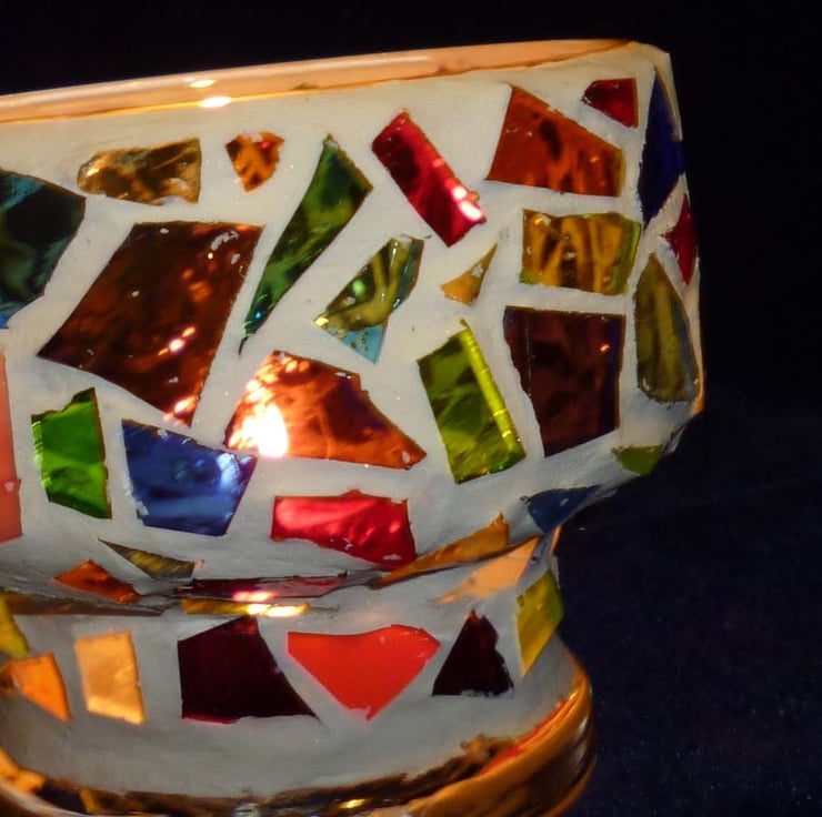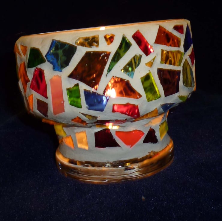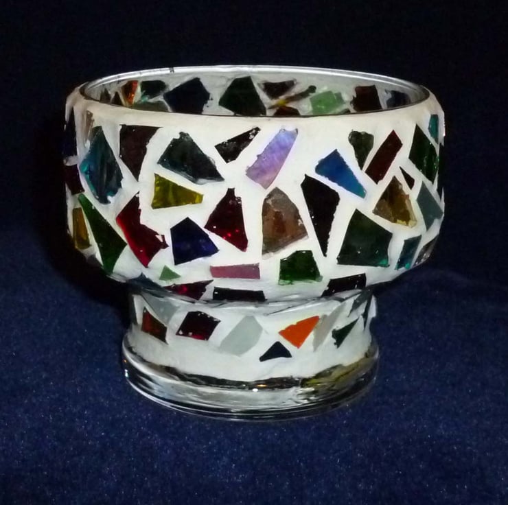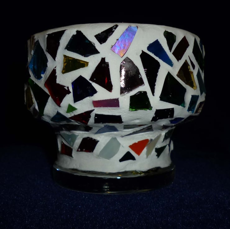 A beautiful hand made glass mosaic, shaped candle vase. Made from a shaped glass, & mosaiced in a mixed colour palette with highlights of irridescent coated glass. This is then grouted in a white grout to give a lighter feel to the piece when not lit, than the black grouted versions I usually make.