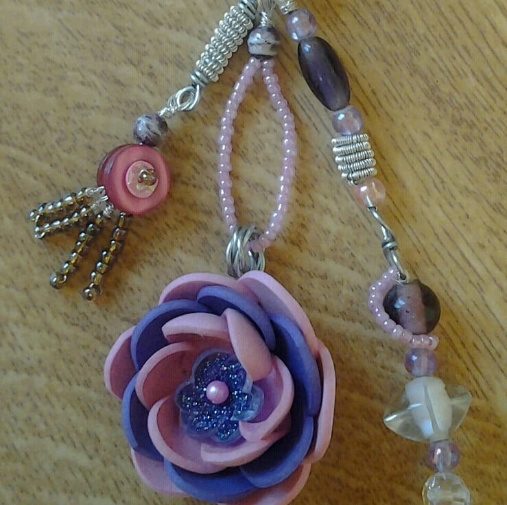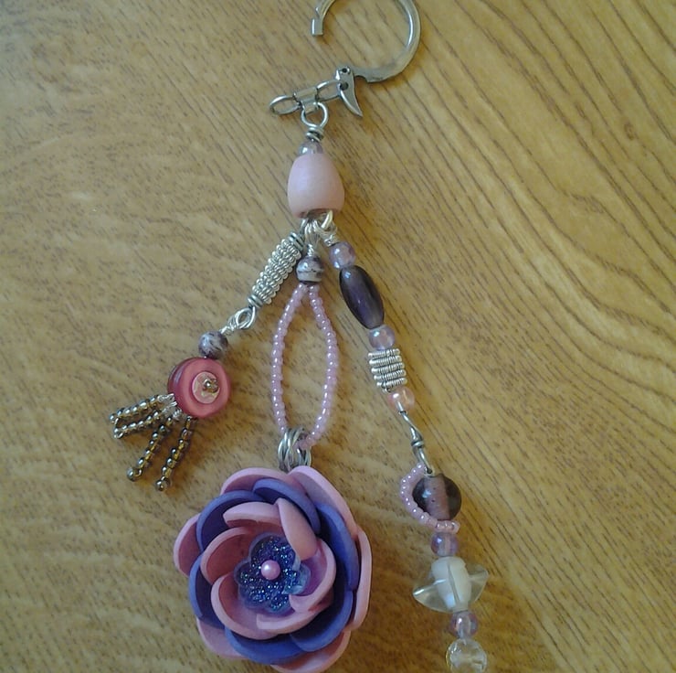 This pretty bag charm has been made using a variety of different glass, plastic and wood beads wired together and attached to a clip ring fastening. The flower itself has been made using sheet craft foam, cut to shape, heated and molded to give a lovely 3 dimensional flower and centre piece to this lovely little charm.